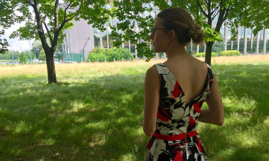 Omdat het de eerste keer was dat ik met plooitjes werkte, maakte ik dankbaar gebruik van de paspop waarop mijn avondkleed staat. De plooitjes regelmatig en gelijk verdelen is even prutsen en testen, maar als je er de tijd voor neemt, ben je achteraf dankbaar. Omdat mijn stofje niet rekt, moest ik zorgen dat de nepen in de top perfect passen. Opnieuw komt mijn paspop hier goed van pas. Wat extra naadwaarde voorzien, voorkomt ook veel gevloek.