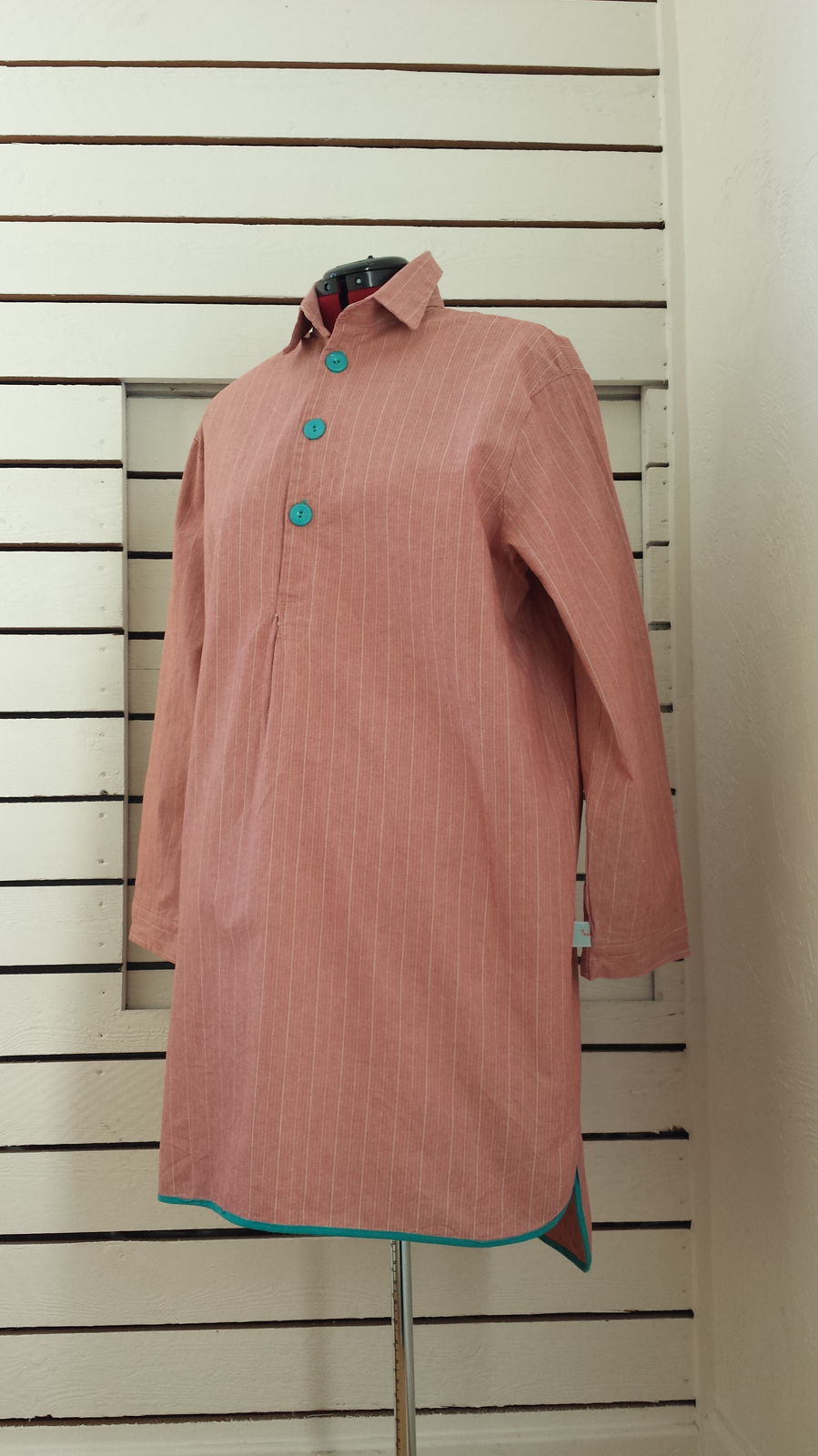 Maar terug naar het heden… Mijn stiefvader van 82 jaar zweert bij nachthemden, maar houdt niet van de saaie kleuren en stoffen waarin deze gemaakt zijn. Dat vond ik pas een leuke uitdaging! De patronen voor nachthemden liggen helaas niet dik bezaaid. Ik tornde dus een versleten nachthemd helemaal uit elkaar, na de coupe bestudeerd te hebben, om vervolgens een nieuw patroon te tekenen, en te gebruiken op een leuke stof, gevonden in de uitverkoop van Samira in Gent. Ik maakte voor het eerst met de naaimachine ook mooie knoopsgaten in een contrasterend garen, en werkte het geheel af met een bies in dezelfde kleur. In de zijnaad verwerkte ik mijn naamlabel ‘Noucha’s pride’. En of ik trots was op deze creatie! In mijn onwetendheid was ik echter vergeten de maten van mijn stiefvader op te meten, en kwam ik achteraf tot de conclusie dat de armen te lang waren, en het buikgedeelte wat te breed. Deze Kerst heeft mijn stiefvader mij een nieuw nachthemd gevraagd… deze keer liefst op maat.