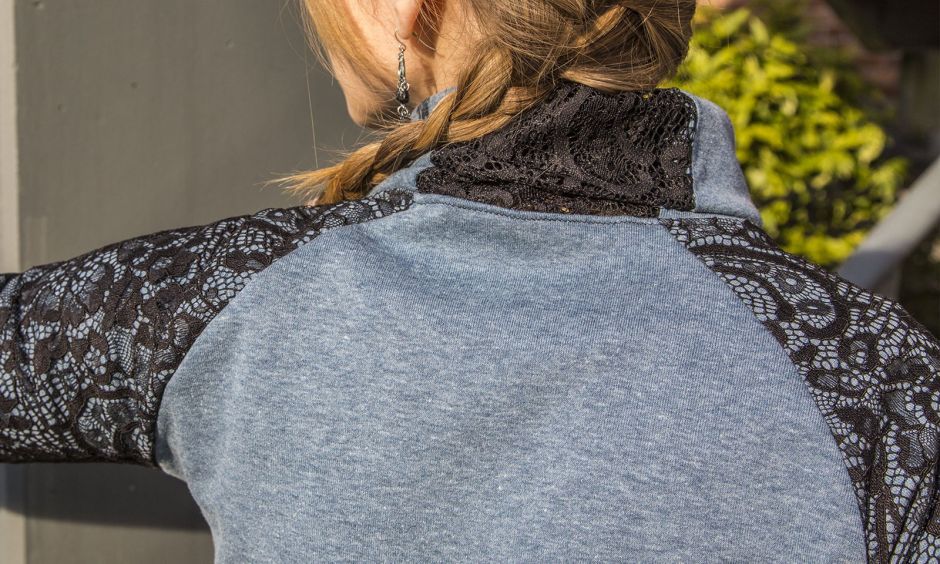 Het is een makkelijk patroontje, al moest ik vanaf de taille naar de heupen toe wel wat innemen, maar op het eind liep het toch even mis. De rolkraag raakte niet over mijn hoofd… Ik vermoed dat het wel lukt met boordstof, maar ik wilde dezelfde stof als de rest van mijn sweater, en die rekte niet voldoende. Gelukkig merkte ik het op, voor ik de kraag aan het shirt naaide. In plaats van een hele nieuwe lap te knippen, zette ik er een stukje zwarte kant tussen aan de achterkant, en dat vind ik eigenlijk nog wel een leuk detail…