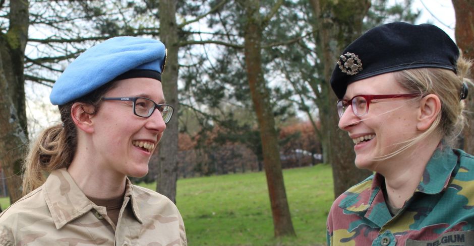 Valt het je trouwens op dat we allebei een ander uniform dragen op de foto’s? Margot trekt naar een heet en zanderig land, en draagt dan ook de desert camouflage en boots met de blauwe muts van de Verenigde Naties. Ik blijf in het groene Belgenlandje, en show mijn dagelijkse plunje in woodland camouflage met de zwarte combats. In het dagelijkse leven kleuren we dus hetzelfde, en ook onze baret van de genie is dan identiek.