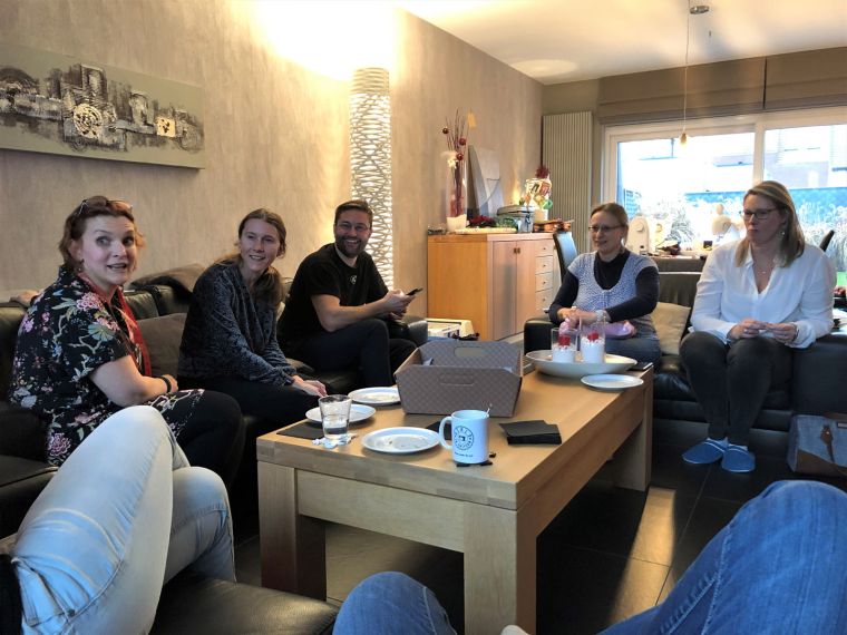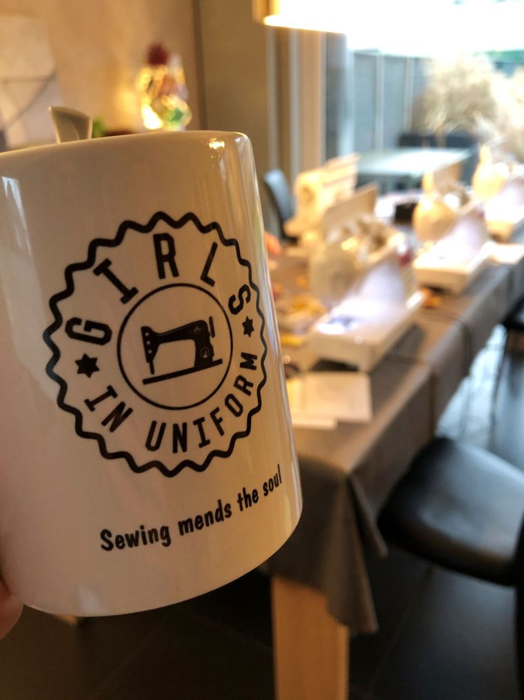 Tegen de middag begonnen alle lapjes al meer een Blanche vorm te krijgen, dus kwamen de lekkere broodjes net op tijd. De lunch was ook ideaal om pakjes uit te wisselen met naaispullen en stofjes die we zelf niet konden gebruiken. Joepie, weer nieuwe stofjes! Dat waren niet de enige cadeautjes die dag, want Lieve trakteerde de Girls elk op een leuke beker met ons logo, Tatiana gaf ons ons mooie naaitasje en ook Katrien had een attentie meegebracht. We werden verwend!