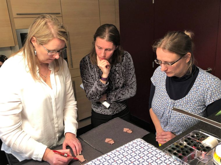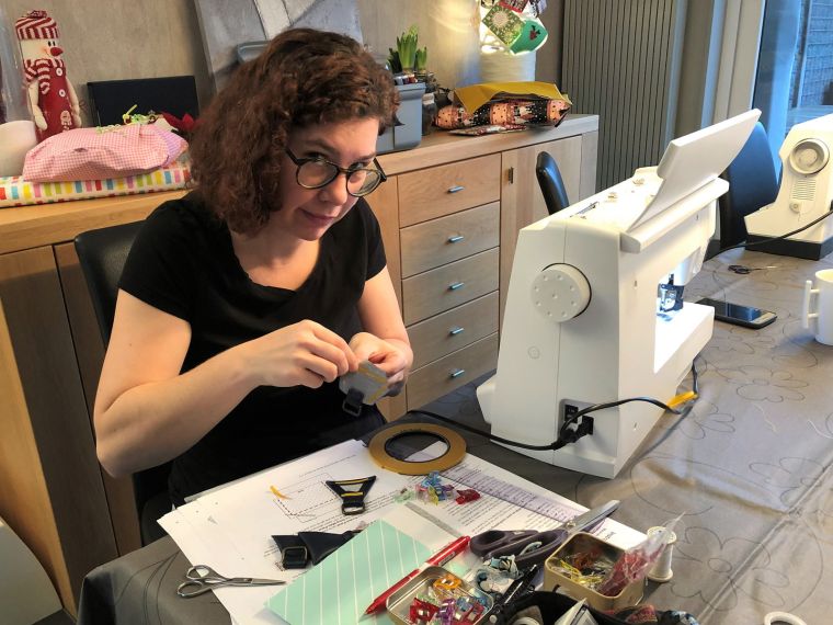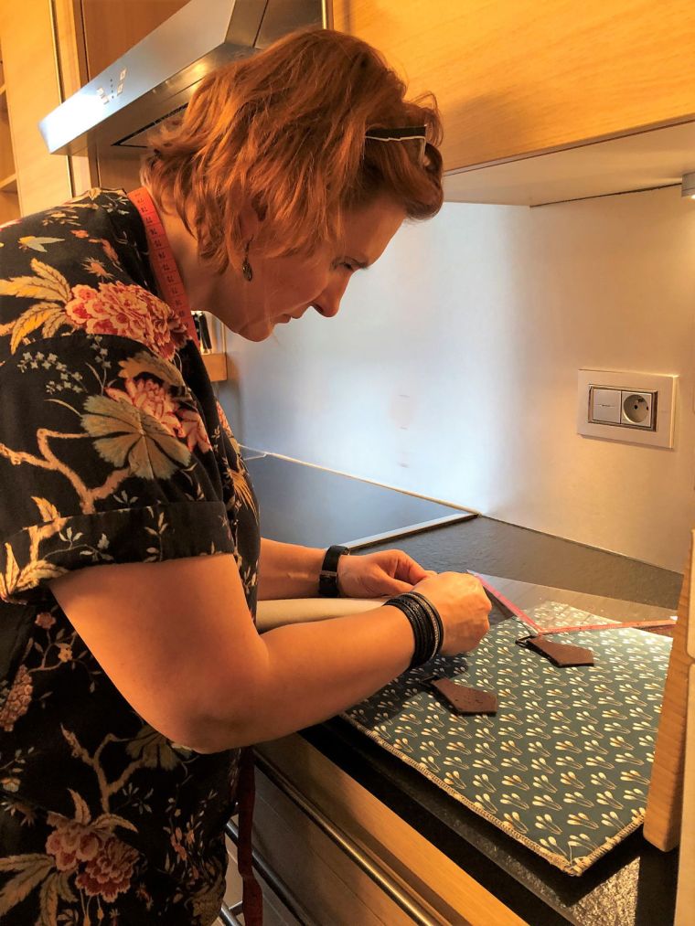 De Blanche is een populair model van Swoon. De workshop duurt een hele dag en vraagt wel wat voorbereiding. We kregen op voorhand het patroon en de tutorial om ons huiswerk te doen. We trokken dus met onze voorbereide lapjes naar Oost-Vlaanderen, waar Katrien, de koningin van kurkleer, rivetten en verstevigingen, ons door alle stappen zou loodsen.