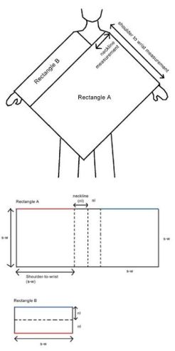 Mijn eerste pin wordt een poncho. Ik heb die dingen altijd super klassevol gevonden, maar vond er nooit eentje die me goed stond. Dus waarom maken we hem niet zelf? Eigenlijk is het maar een deken met een gat voor je hoofd, right? Pins met poncho’s genoeg op Pinterest maar deze tekening was zo simpel dat-ie niet mis kon gaan. Helemaal enthousiast trok ik naar de markt om twee meter wollen stof in een mooie taupekleur. Zwaar genoeg om lekker door te vallen maar niet echt zacht. Met een lichtbruine fleece als voering was dat een stuk beter. De poncho zat snel in elkaar. Het zijn feitelijk maar twee lappen die je aaneen moet zetten Ik knipte wel overal 15 cm af, wat hem toch iets pittiger maakte. Volgens de pin was mijn poncho nu klaar maar hij leek wel heel gewoontjes.