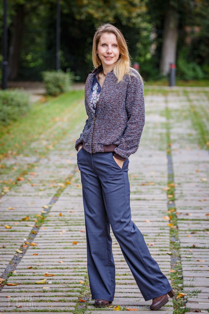 Met mijn ‘basisstoffen’ -die ik al in de kast liggen had- in de hand, trok ik naar Stoffen Van Leuven voor een uurtje stoffen kijken en vergelijken. De stof van mijn Nia wilde ik ook gebruiken als voering van het jasje, en ook broek en rok die ik maakte bij de capsules moesten bij het jasje passen. Een hele uitdaging! Gelukkig nam een van de verkoopsters de tijd om samen met mij alles uitgebreid te bekijken. Ze dook zelfs haar magazijn in, om de uiteindelijke winnaar boven te halen: een prachtige stof met een gebreide look, in de basistinten blauw en bruin. Ideaal! Ook boordstof en rits waren snel gekozen. Ik popelde om eraan te beginnen.