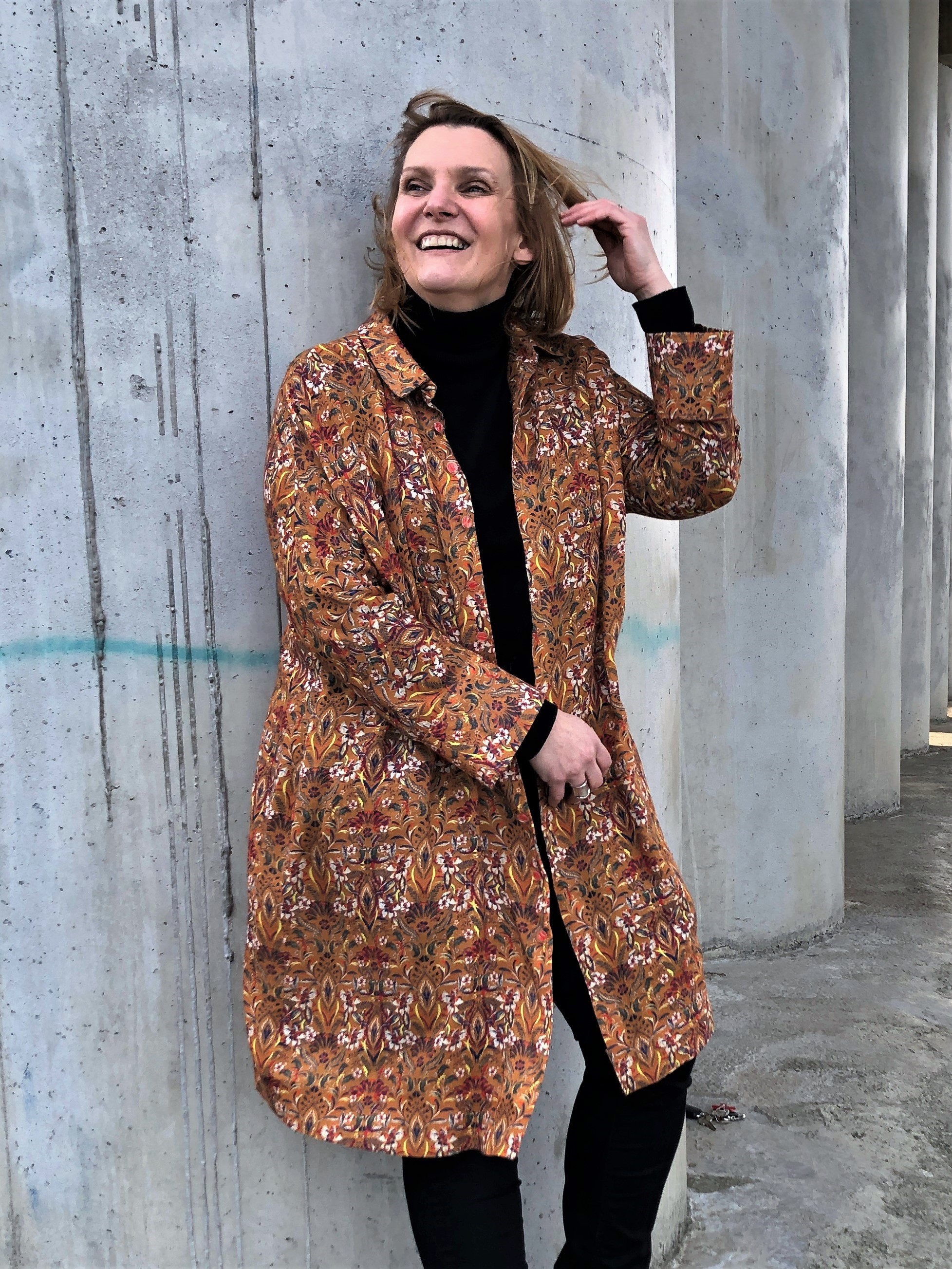 Maar niet getreurd, twee maanden geleden heb ik in een moment van de neerwaartse golfbeweging toch even de draad terug opgenomen en mijn Indira afgewerkt. Ik had vooral schrik om knoopsgaten te maken in mijn mooie viscosestof maar dankzij de versteviging, en de tips en tricks van internet lukte dit al vlot bij de eerste poging. Aan een gestikte zoom waagde ik mij niet, maar dubbelklevende gordijntape was voor mij de ideale oplossing. Fier dat ik was op mijn eerste naaisel sinds 2019! Je zal mij de hemdjurk niet snel zien dragen als jurk, het model is daarvoor iets te weinig gecentreerd, wat aan een peervormige curvy-lady zoals ik al snel een ‘tent’gevoel geeft. Maar als overhemd op een neutrale jeans en t-shirt is het een prima eyecatcher!
