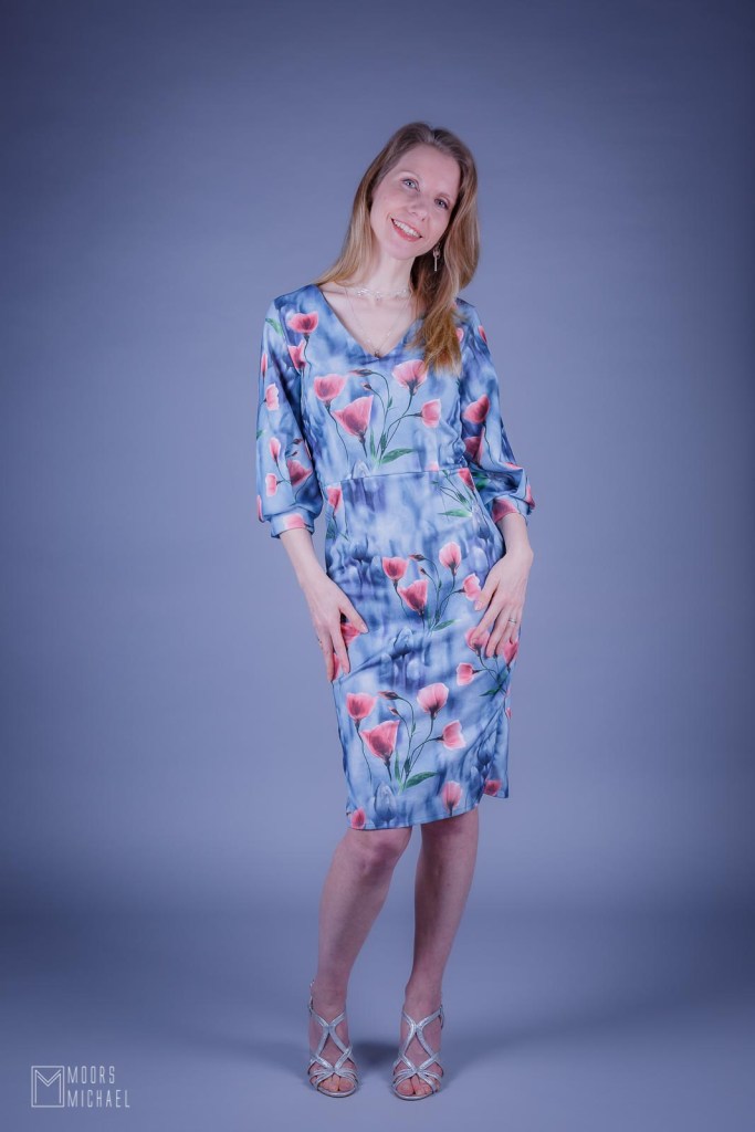 Zoals we het gewend zijn van Designer Stitch, bevat het patroon ook deze keer weer tal van mogelijkheden. Je kan kiezen voor een rechte of een wijde rok, telkens in verschillende lengtes. De hals werk je af in een V of gewoon rond. Voor de mouwen kan je kiezen uit drie modieuze variaties: een ‘Bishop sleeve’, een ‘Petal sleeve’ of een 3/4 sleeve met pleated cuff’, waar ik meteen verliefd op werd. Ik ging bij mijn Brenda voor een elegante V-hals, 3/4 mouwen en een rechte rok tot boven de knie. Het patroon voorziet een blinde rits op de rug, maar in ‘mijn’ versie is een rits helemaal niet nodig. Bij de ronde hals zou ik er natuurlijk wel voor kiezen… maar het patroon is gemaakt voor Scuba crêpe en die is voldoende rekbaar.