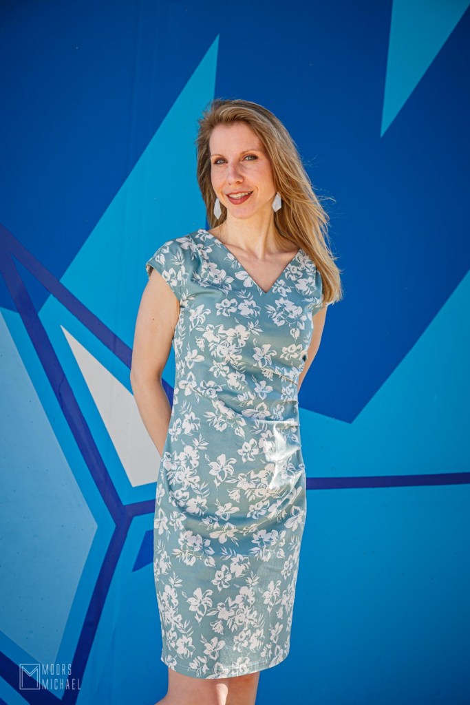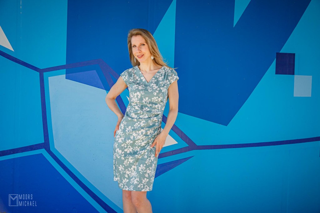Zo ook met La Maison Victor 2 van maart-april 2021. Ook nu had ik de ideale stof niet in huis, al gingen er deze keer geen maanden overheen voor ik aan de slag ging met de Eileen jurk. Toen ik deze prachtige satijn-stretchkatoen van Minerva spotte in de kleur ‘Duck Egg’, wist ik dat die twee bij elkaar hoorden. In mijn omgeving slaakten een paar mensen een zucht van opluchting: ik koos een keertje niet voor blauw, intussen de hoofdkleur van mijn garderobe. De stof was ‘in het echt’ nog mooier dan op mijn computerscherm. De kleur, de print en de textuur van de stof lieten mij in de regenachtige meimaand verlangen naar de zomer.