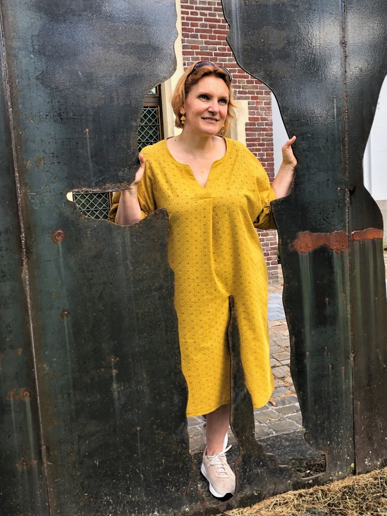 Bij Toverstof ontdekte ik een okerkleurige broderie anglaise, een fijn katoenen stofje zonder rek maar heel fijn om mee te naaien. De stof laat ook toe om wat volume te naaien in de mouwen. Dankzij de variatie in de stof kon ik ook mijn ‘accidentje’ camoufleren. Bij het overlocken heb ik namelijk in mijn enthousiasme per ongeluk een deel van de kraag vooraan in twee gesneden. Balen, maar dankzij wat plakvlies en het betere camouflagewerk kon ik toch vermijden dat mijn jurk in de vuilbak belandde.