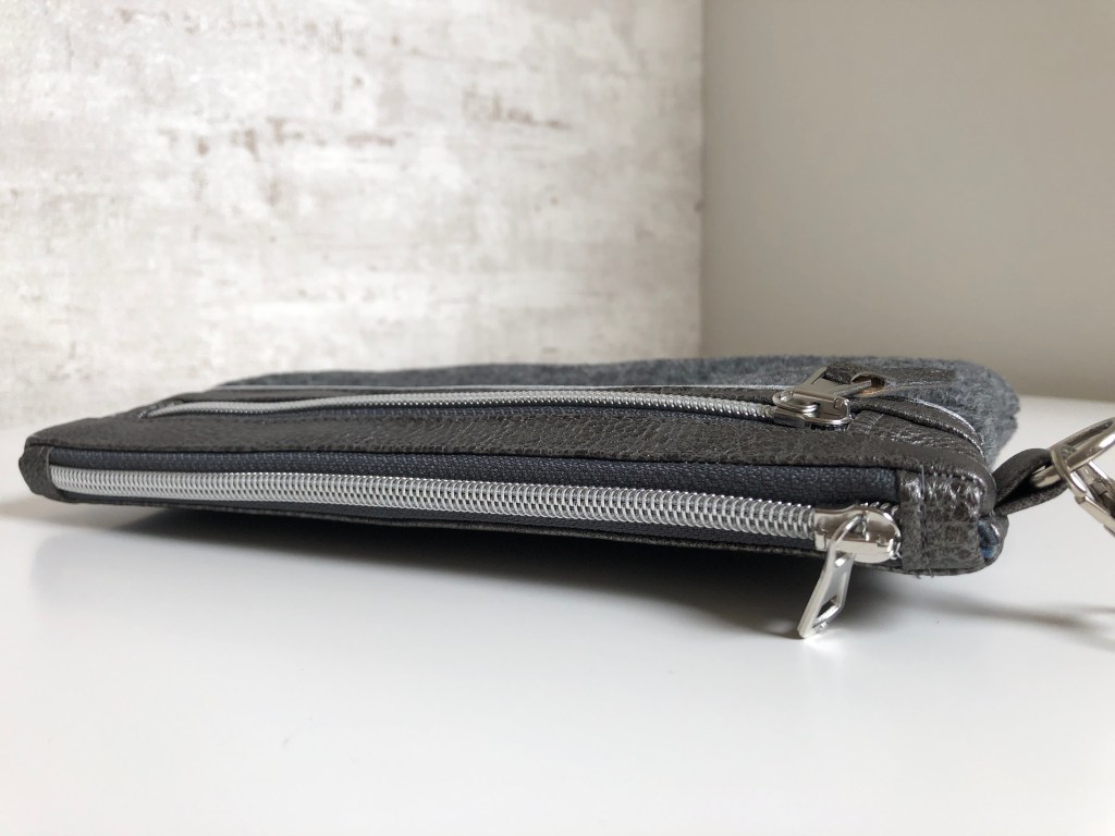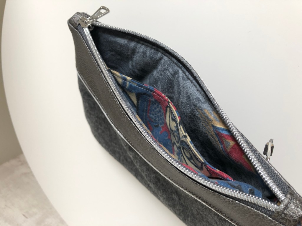 De aandachtige lezer herkent de materialen van een eerder projectje. Ik vond de combinatie toen zo goed meevallen, dat ik het op dezelfde manier deed. Het superzachte fluffy stofje is de binnenkant van een alpenfleece (gekocht bij De Stoffenknop) die ik gebruikte voor Michael’s thuisbroek. Restjesverwerking, weet je wel? De rits op rol kocht ik bij Toverstof en past perfect bij de grijstinten van de rest. De paspel en het grijze kunstleer komen ook van bij Toverstof. Het kleurrijke stofje voor de voering is een oud tafelkleed van mijn mama, dat al verschillende keren gebruikt is voor mijn tassen.