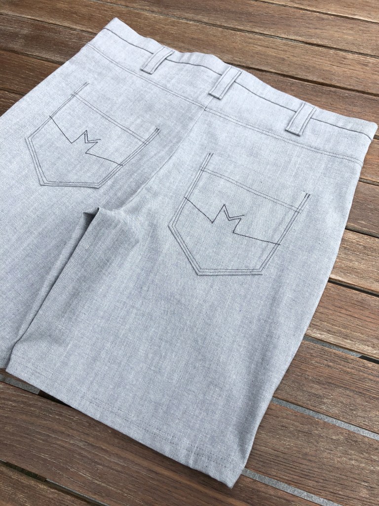 Ik paste nauwelijks iets aan aan de short, maar de achterzakken vond ik toch een beetje vreemd. Die waren dubbel zo lang als ik gewend ben, dus die kortte ik een beetje in. Net als bij zijn meest recente Louis short, naaide ik Michael zijn logo op de achterzakken. Ik teken het logo op patroonpapier, stik er met een dubbele steek over, en scheur het papier er dan af. Een leuk en persoonlijk detail…