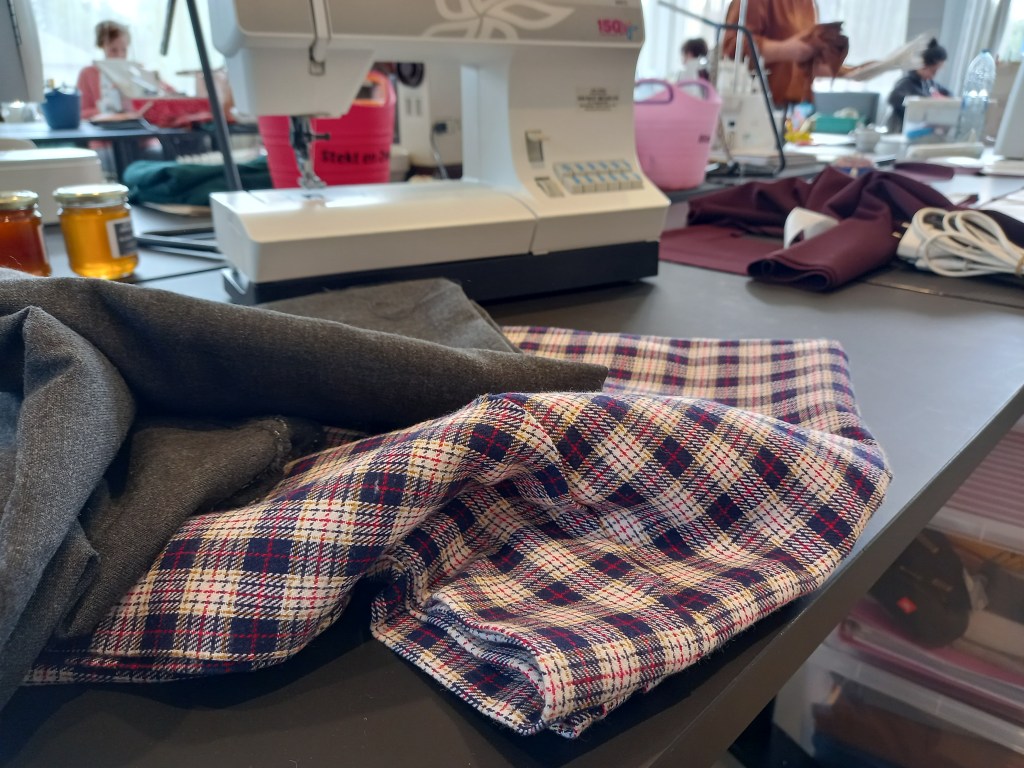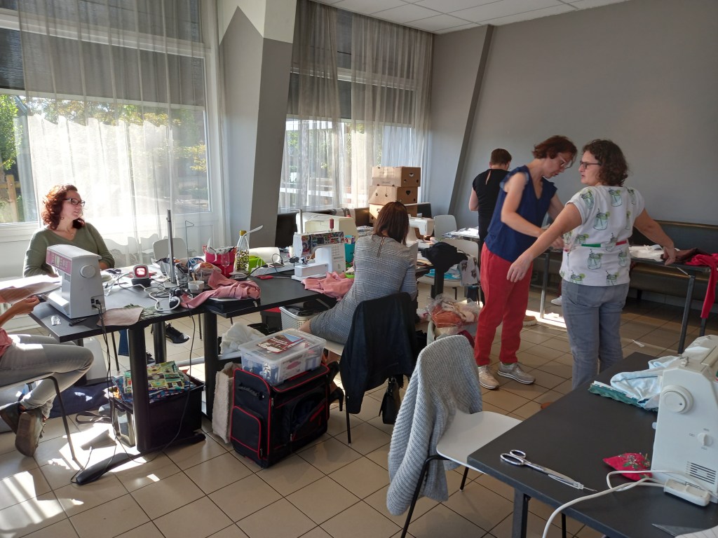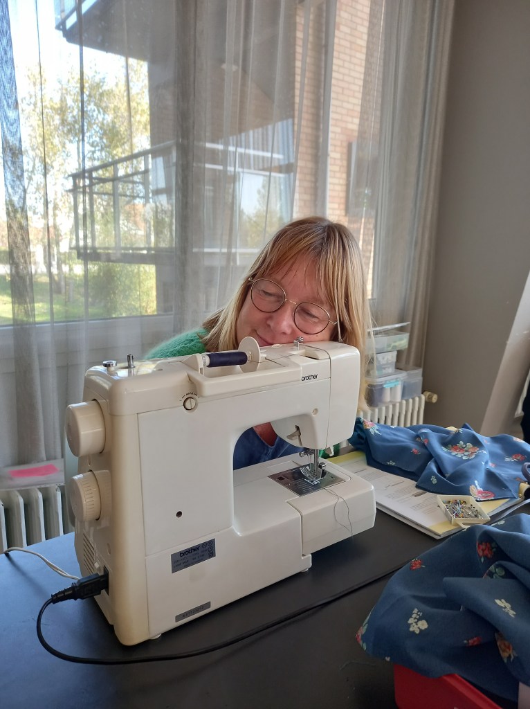 Ik weet niet of het lag aan het weerzien met een paar naaivriendinnen, aan het leren kennen van toffe mensen, het supervriendelijke personeel van het centrum of gewoon aan de hele sfeer, maar vrijdagnacht stak mijn eerste naaisel in elkaar en ik heb het hele weekend getaterd, geschaterd, genoten en jawel… genaaid. Omdat dit een West-Vlaamse naaigroep is, moest ik het exotische accent er wel bijnemen, waarbij ik iets vaker moest vragen wat iemand bedoelde (of gewoon zei) maar zondagmiddag verliepen mijn vervoegingen van ja en nee toch al wat vlotter.
