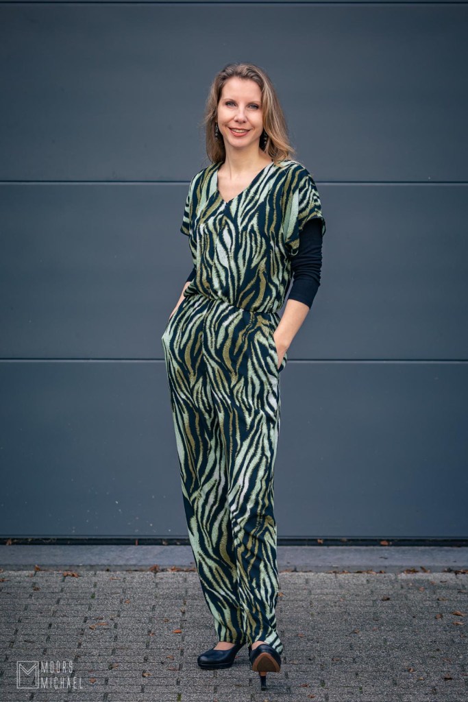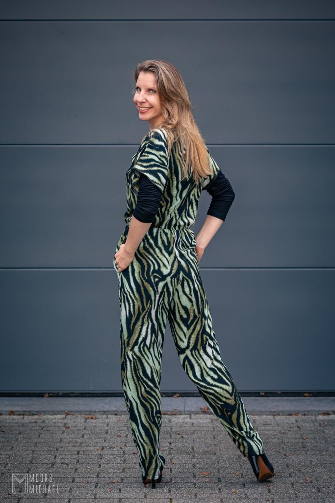 De eerste pas deed ik voor ik de elastiek naaide en het geheel deed mij denken aan een gevangenisoverall. Ik kon mij niet inbeelden dat ik aan het eind van de rit blij zou zijn met mijn naaisel… Maar eind goed, al goed, dat effect was helemaal weg eens de jumpsuit volledig afgewerkt was.
