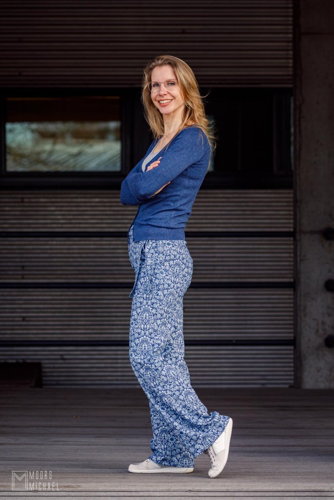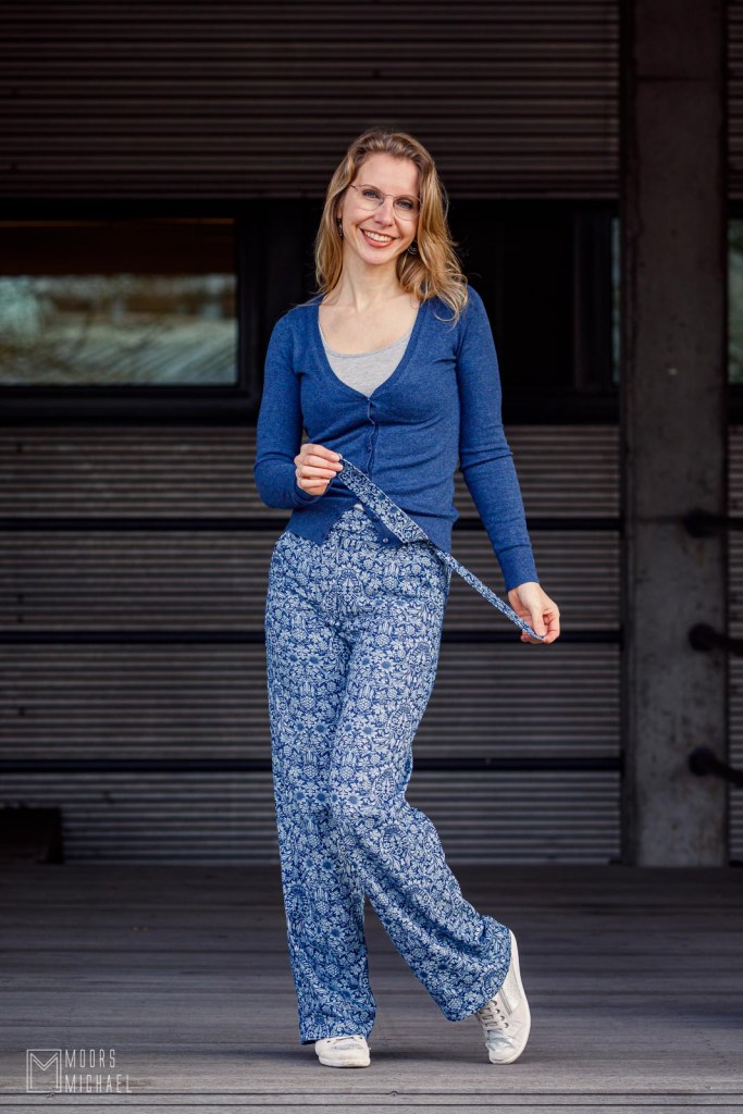 Aan het einde van de rit wilde ik nog een leuk accent, dat op deze foto’s niet zo duidelijk is. Maar af en toe draag ik wel eens graag mijn t-shirt of truitje in de broek. Daarom voegde ik lusjes toe aan de tailleband en maakte ik een striklint in dezelfde stof als de broek. Dat zet je taille nét wat meer in de verf, toch?