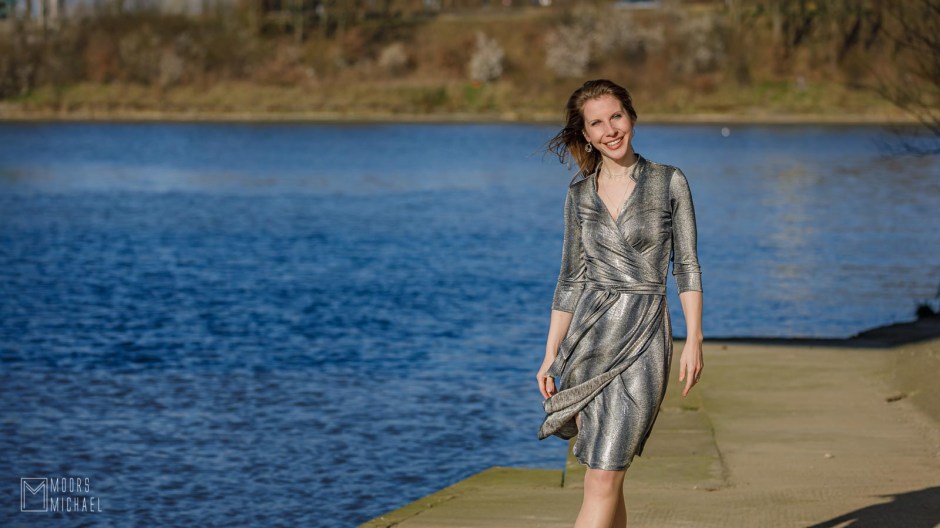 Bij wikkeljurken ben ik altijd bang dat de rok van het minste zuchtje wind mijn ondergoed laat zien… Tijdens de ijskoude fotoshoot deed de wind zijn uiterste best (dat zie je aan mijn uitgewaaide kapsel en aan de capriolen die mijn rok uithaalt), maar meer dan mijn ‘kousenband’ kreeg niemand te zien. Eerlijk gezegd heb ik de wind -voor de grap- daarbij wel een beetje geholpen door mijn rok een duwtje te geven… Een fietstest heb ik nog niet gedaan en zou ik waarschijnlijk niet aanraden, maar deze wikkeljurk is erg praktisch en je kan zonder zorgen de deur uit.