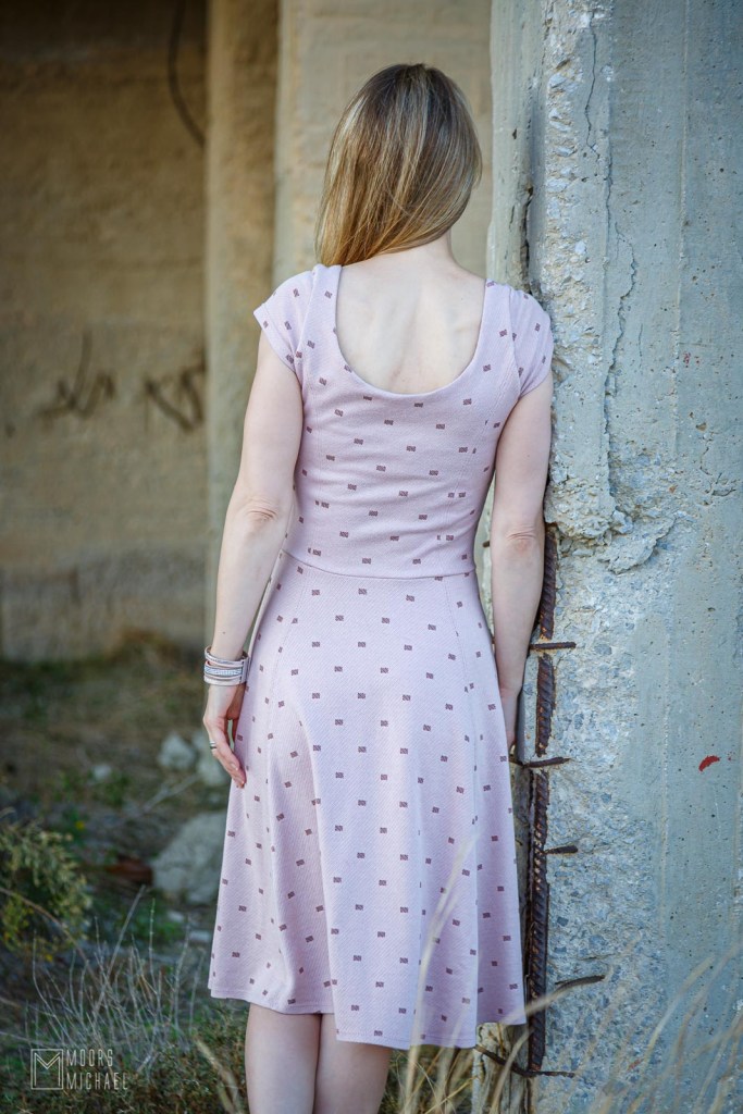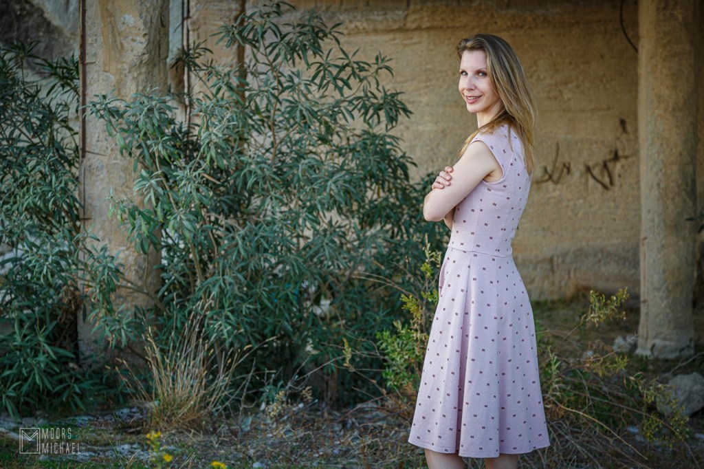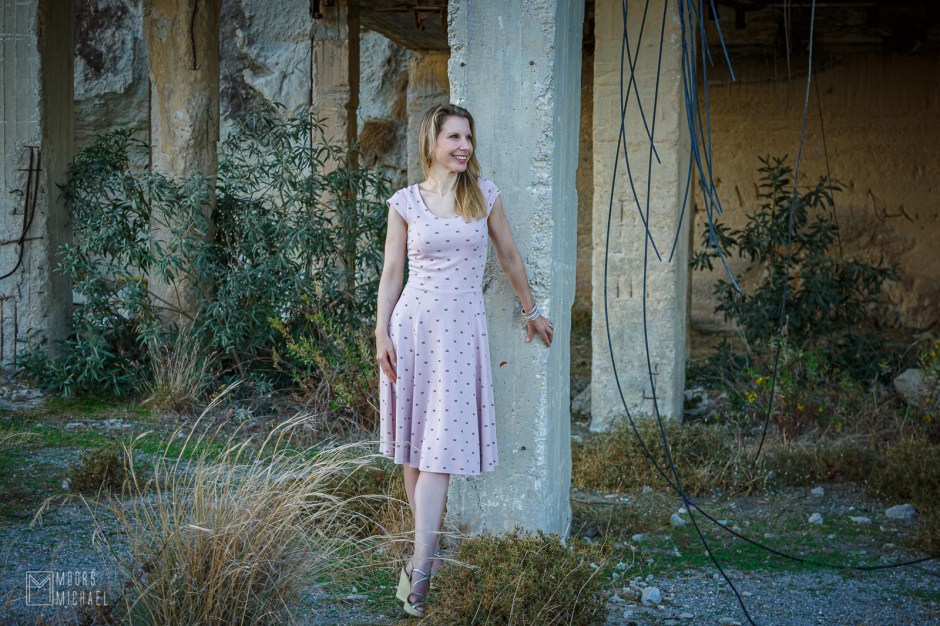 De jurk ging in oktober mee in de valies, tijdens ons groot verlof op Rhodos. Tijdens een van onze wandelingen vonden we een leuke ruïne, waar we de fotoshoot voor deze jurk deden. De plek intrigeerde ons. Het leek een uitkijkpost op een berg, maar iets deed ons vermoeden dat het gebouw een militaire functie had. We zullen het wellicht nooit weten… Dit decor is eens iets anders, en een blijvende herinnering aan een heerlijk ontspannende vakantie.