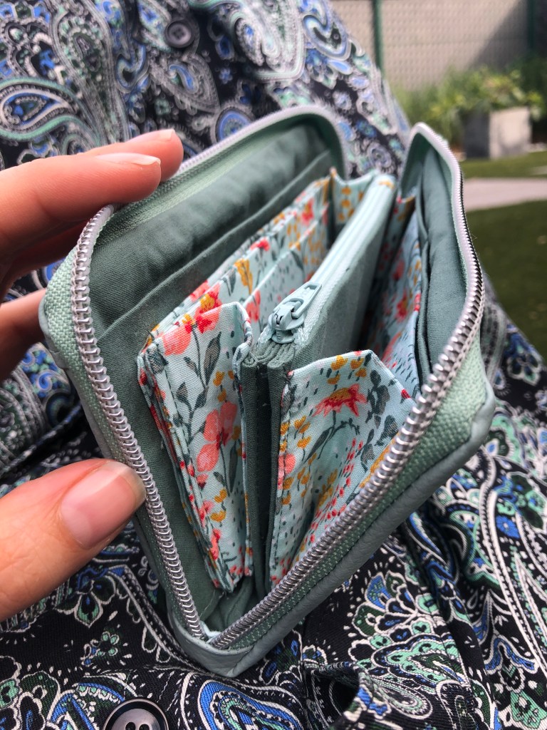 Zo’n portefeuille, daar kruipt toch wel wat werk in… Patroon printen en knippen, patroondelen uit de stof knippen, alles verstevigen en dan het naaiwerk. Volgens mij ben ik er toch een dag of twee mee bezig geweest. Maar ik verveel mij tijdens dat hele proces geen seconde. En telkens als er weer een stukje van de puzzel op zijn plaats valt, schijnt de zon!