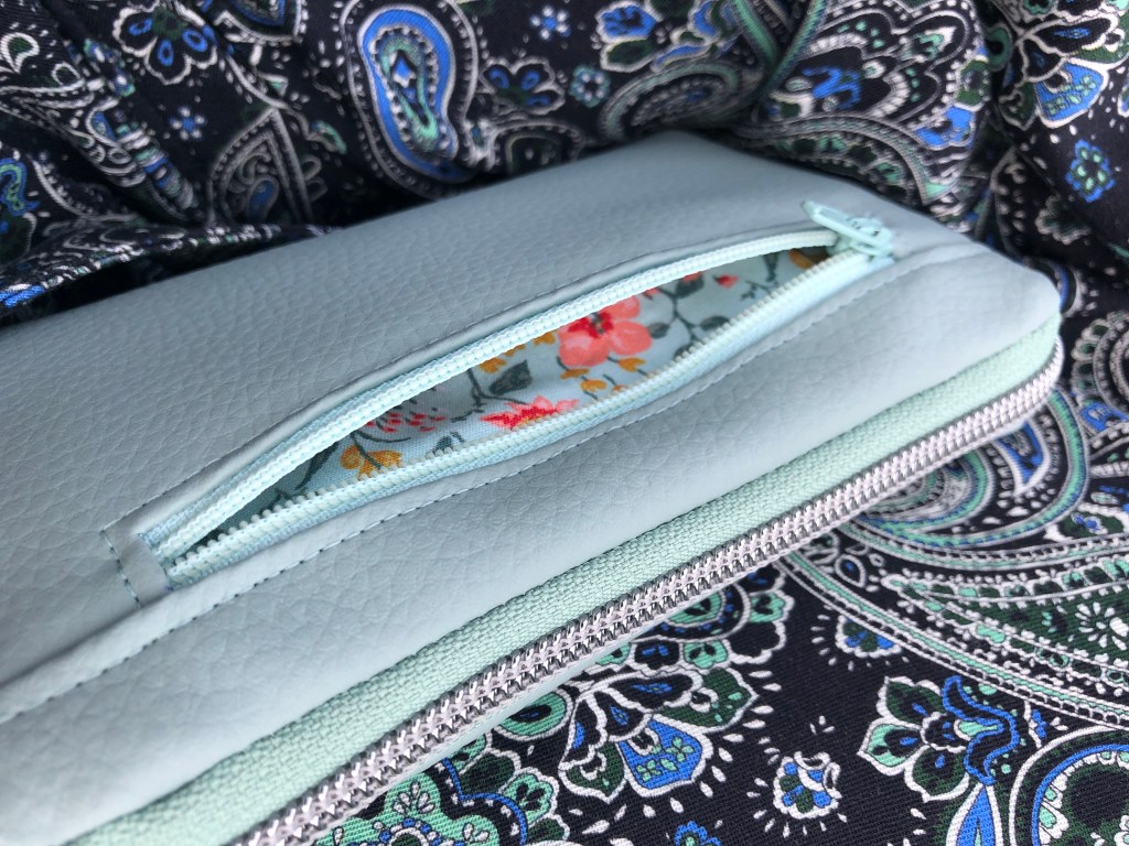 De materialen ging ik shoppen bij Dubbel Punt, de creatieve hotspot die ZipperZoo en PiekeWieke samenbracht. Het prachtige katoentje van de voering kocht ik bij PiekeWieke. Het is intussen uitverkocht, maar neem gerust een kijkje op de site, Lieve verkoopt nog zoveel moois! Het kunstleer aan de buitenkant in het mooiste munt vind je hier bij ZipperZoo. Een deel van de binnenkant maakte ik uit smokey geen dry wax cotton. Ook de rest van de fournituren vind je bij Zipper Zoo.