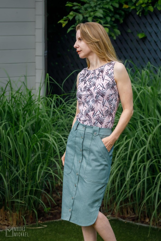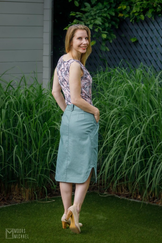 De rok is recht van model, komt tot een eindje onder de knie en heeft een hele resem mooie details. Zo heb je de leuke ruime opgestikte zakken die de rok een heel aparte look geven. De tailleband is afgewerkt met riemlussen, met telkens een knoop als eyecatcher. Om je de nodige ruimte te geven om makkelijk te stappen, voorziet het patroon aan de zijkant mooie afgeronde splitten.