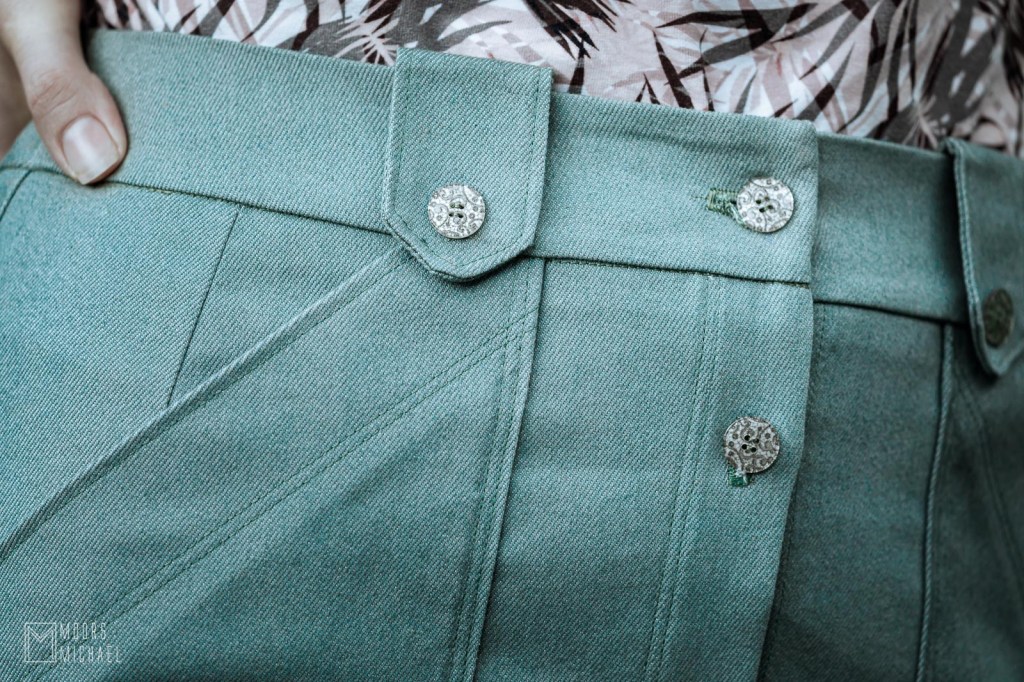 De mooie mosgroene jeans met een beetje stretch ging ik halen bij Toverstof. Omdat het een doorknooprok is, ging ik er ook op zoek naar bijpassende knopen en oh, wat vond ik er mooie…