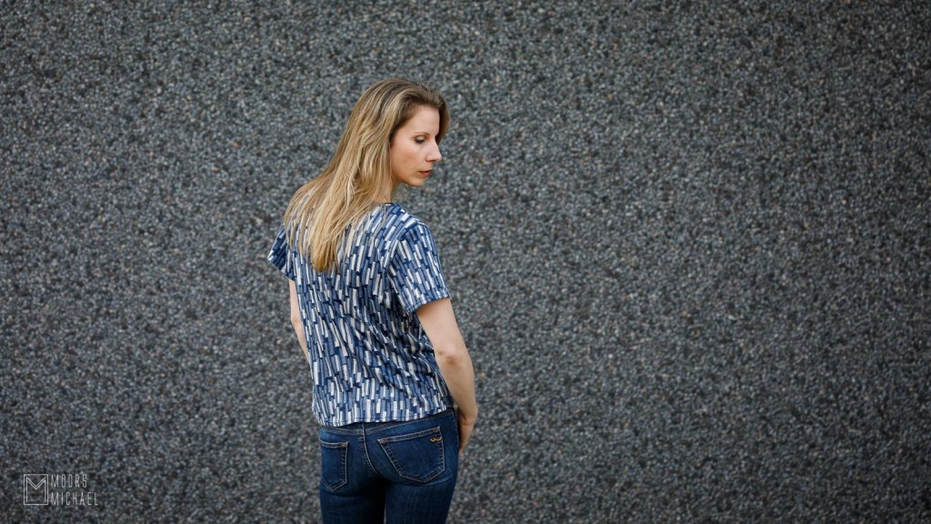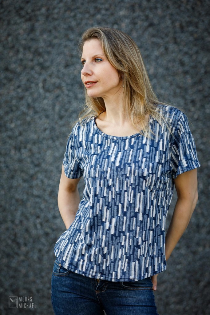 Al vraagt het patroon om een geweven stofje, ik koos (tegendraads als ik soms ben) voor een stevige tricot uit de winkel van PiekeWieke. Een tijdje geleden maakte ik al eens een Vita van FibreMood uit deze stof en die draag ik supergraag. Het is letterlijk zo’n top van: wassen, op de kapstok drogen en terug aan! Toen ik zag dat PiekeWieke de stof nog steeds verkocht, twijfelde ik geen seconde. Jammer genoeg is de mooie ‘veelblauwerige’ stof nu niet meer te krijgen, maar je vindt er nog véél meer moois!