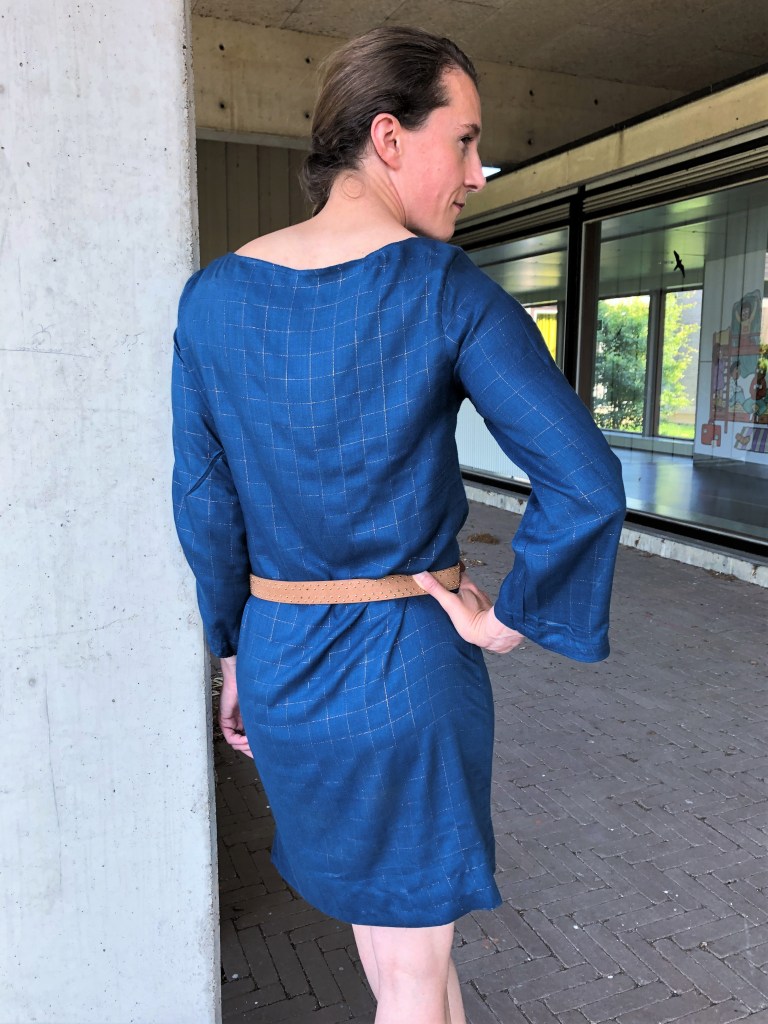 We kennen allemaal wel het probleem: je bent gek op een stofje maar kan niet beslissen wat je ermee moet maken. Toen ik in Marie Karo een donkerblauw viscose stofje met lurex zag, was ik direct verkocht. Maar wat maak je ervan? Nog een kleedje of toch eens een hemd? Het donkerblauwe stofje was zo soepelvallend dat ik vreesde dat een hemd iets teveel als een patattenzak rond mijn lijf zou hangen. Dus heb ik toch weer voor een jurk gekozen want daar kan je er niet voldoende van hebben. Toch?