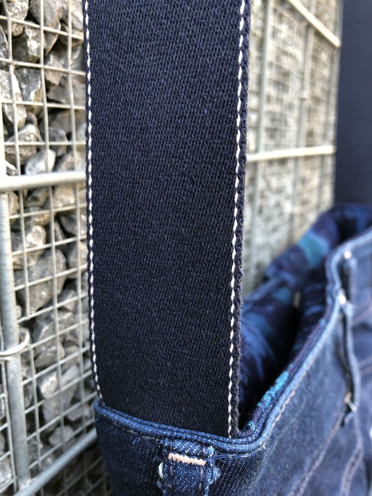 Het voeringstofje had ik nog liggen uit lang vervlogen tijden. Het is soort synthetische tricot en kwam toen van Toverstof. Omdat het een rekbare stof is en ik graag een tas heb met een beetje body, verstevigde ik de voering met Vlieseline H640. De groene en blauwe tinten van de stof passen wondermooi bij het donker indigoblauw van mijn rok… euh… van de buitenstof.