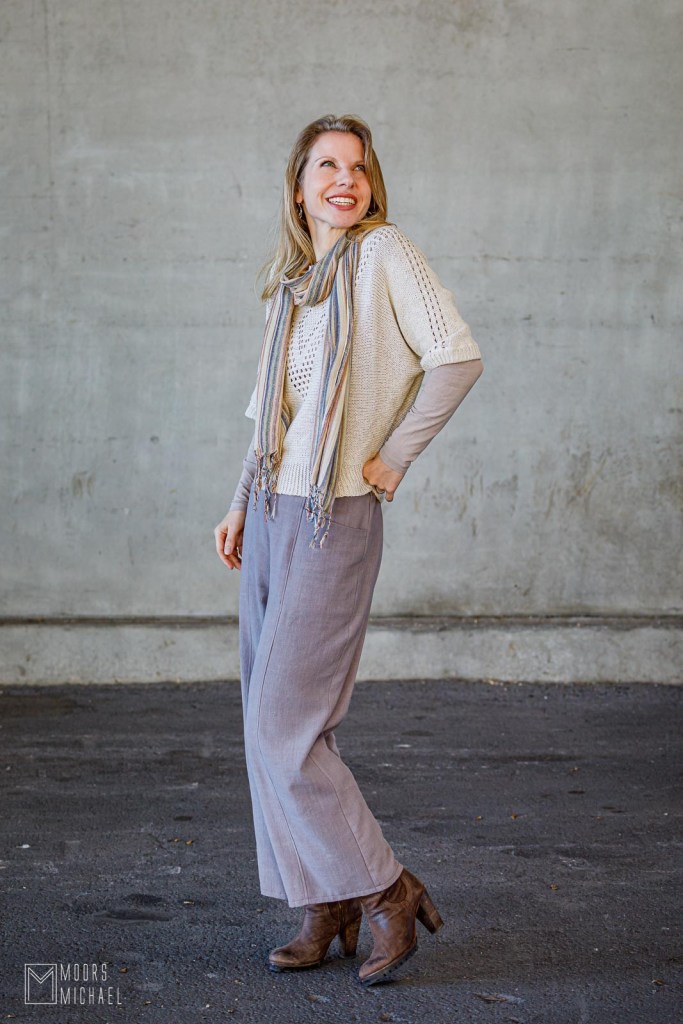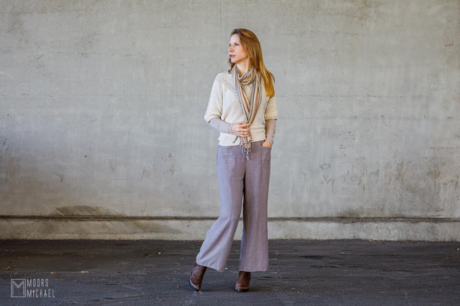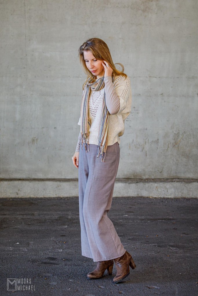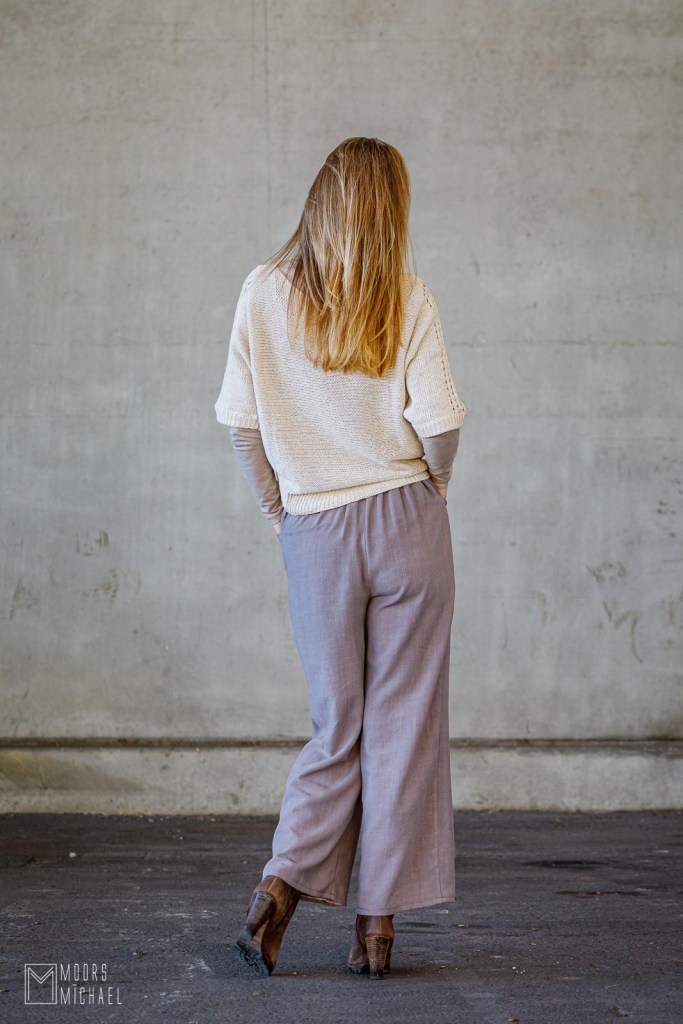 Een wijde broek knip ik meestal extra lang. Ik heb graag dat ze nét niet over de grond sleept, want dat verlengt mijn korte beentjes een beetje. Aangezien ik de broek had ingekort wegens te weinig stof, voldeed de broek a priori niét aan mijn eisen. Eens afgewerkt vond ik de lengte een beetje raar…