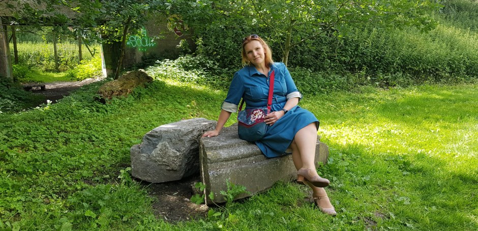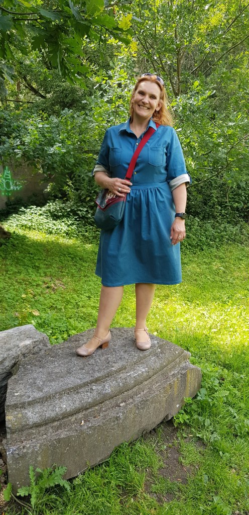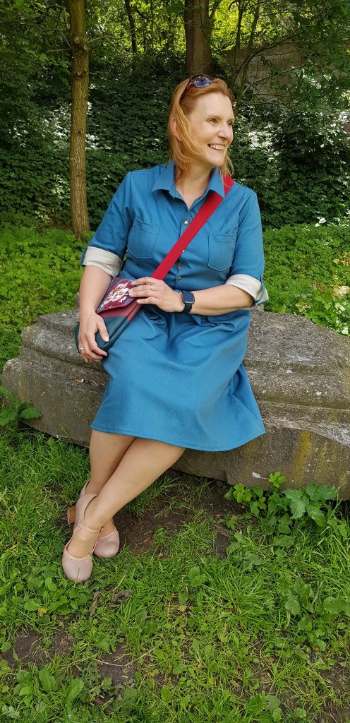 Het patroon zelf is fijn om te naaien met een hoge afwerkingsgraad omdat je overal moet doorstikken. Dit zie je goed op de voor- en achterzijde van het bovenstuk. Ook de opgerolde mouwen vormen een speels accent. Ik verlengde het rokgedeelte met 15 centimeter om na de foto’s te beslissen er toch weer 5 centimeter af te doen. De kleur vind ik ook nog altijd even geslaagd, temeer omdat ik nu ook nog eens een mooie handtas kreeg van Lieve die er perfect bij past.