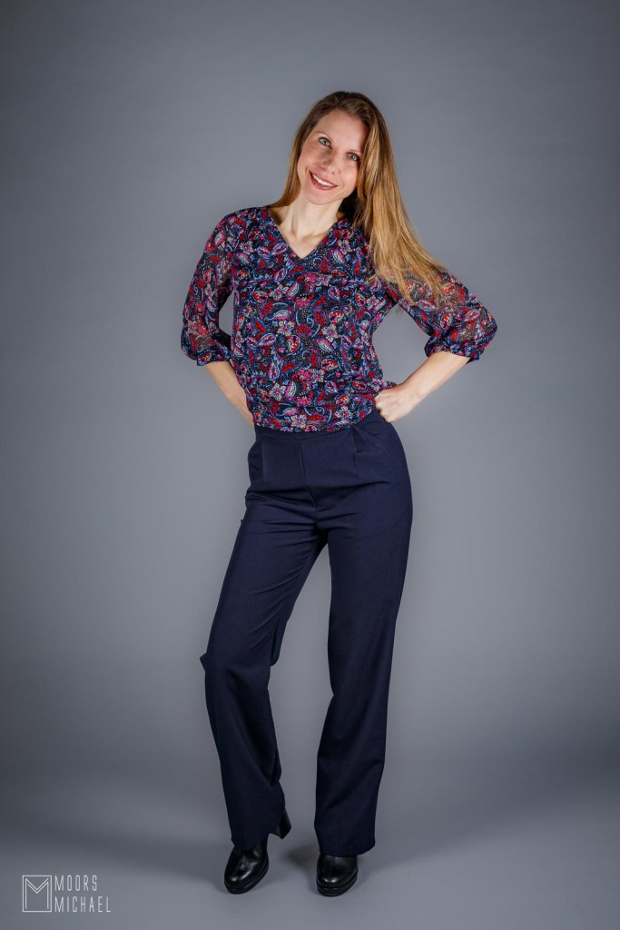 Tijdens de fotoshoot bleef ik maar sjorren aan de broek, in de hoop dat de bandplooien spontaan in de juiste plooi zouden vallen. Dat viel dik tegen! Op die manier ontdekte ik echter het volgende: als ik het teveel aan stof op de buik naar boven trek, is de broek misschien wel draagbaar… Ik ga dus proberen die stof omhoog te plooien en vast te stikken. Als ik er dan een truitje over draag, is de broek misschien nog aanvaarbaar. Wat denk jij?