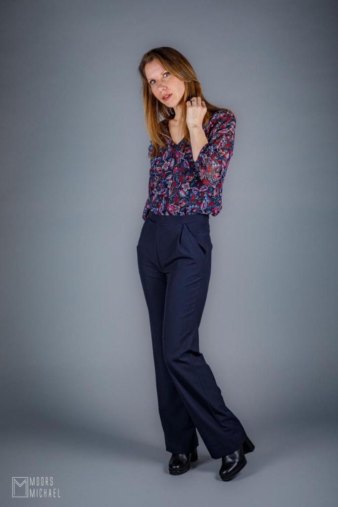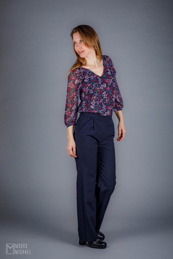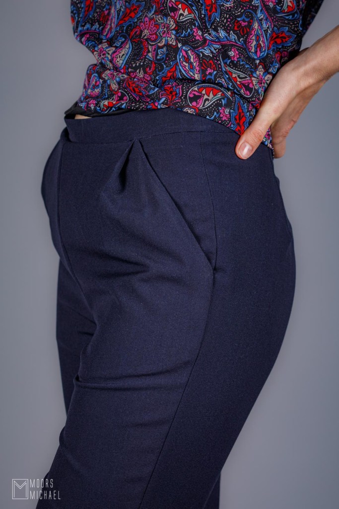 Voor mijn vierde Nia (de testversie voor Bel’Etoile en mijn eerste hack kregen jullie nooit te zien) koos ik een neutrale maar oh-zo-mooie stretch polyester viscose in donkerblauw van Minerva. De effen blauwe stof valt mooi soepel, verwerkt makkelijk en kreukt niet, ideaal dus voor een geklede broek. Aan de stof zal het dus niet liggen dat mijn broek uiteindelijk niet draagbaar is.