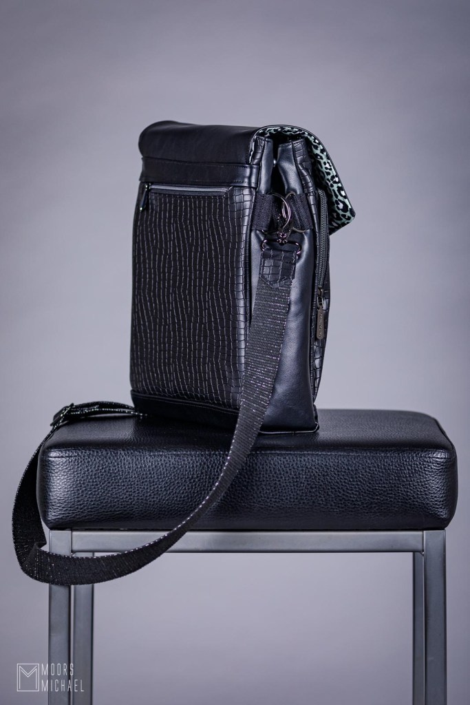Mijn materialen bestelde ik bijna volledig bij ZipperZoo. Zwart is tijdloos en past zowat bij elke outfit, dus ging ik voor een eenvoudige maar stijlvolle versie in effen zwart kunstleer met een croco accent. Omdat zwart ook maar zwart is, koos ik voor een tassenband met zilveren glittertje. Het muntgroene katoentje van de voering had ik nog in mijn voorraad liggen, maar ik heb geen idee meer waar het vandaan komt. De leuke luipaardprint geeft wat pit aan de tas.