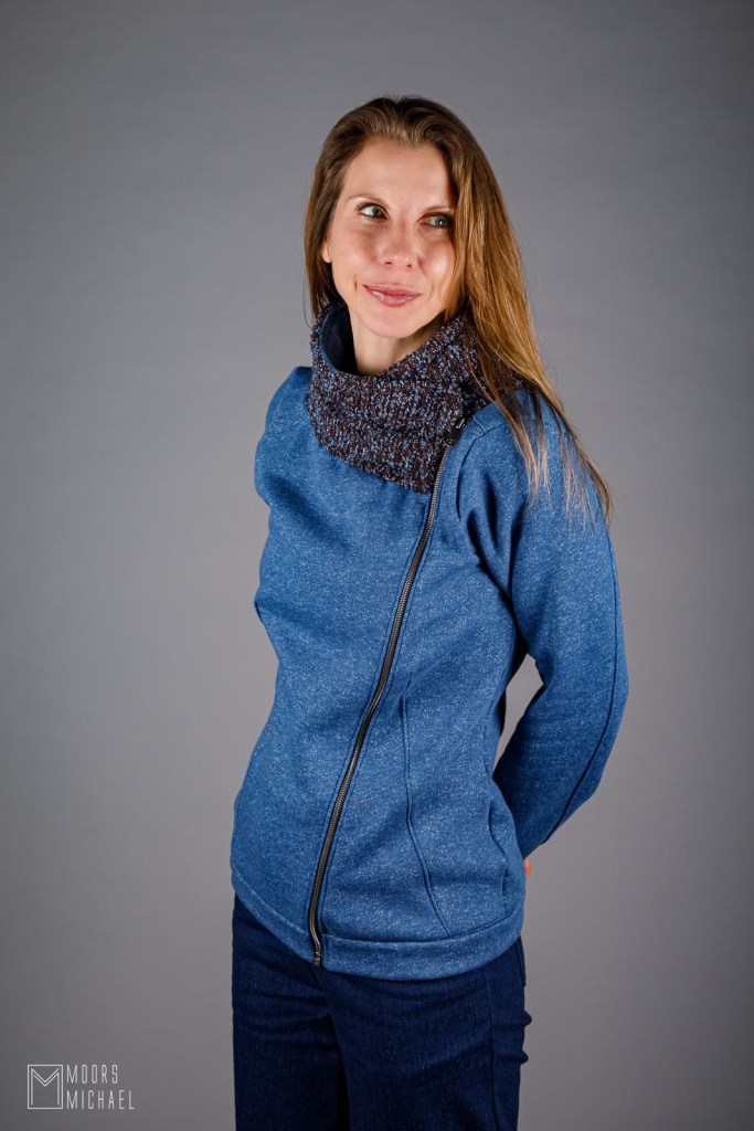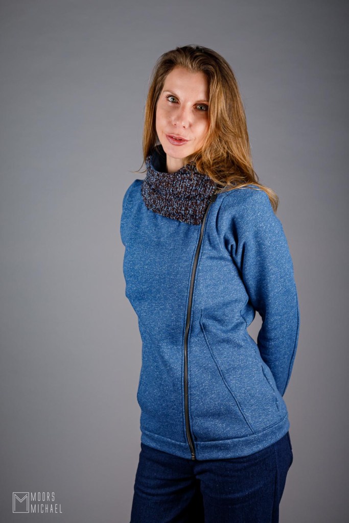 Een wat zwaardere sweaterstof vraagt in mijn ogen om iets anders dan een typische sweater. Deze Minerva Core Range fleece back stof in helder jeansblauw deed mij op zoek gaan naar een soort vestje in rekbare stof. Enter Knip 10/2022, waar patroon 26 mijn aandacht trok.