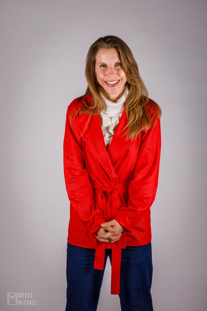 Net omdat het zo ver uit mijn comfortzone ligt, duurde het een hele tijd voor ik het gepaste patroon vond voor die prachtige rode stof. In Knip 2/2023 stond een leuk overslagjasje dat mij meteen aansprak. Het patroon zit ergens tussen een cardigan en een jas in, en ik zag mezelf er al in rond flaneren. Op zoek naar een gebreide stof viel mijn oog op een rode streep in mijn stoffenstapel… en toen wist ik het.