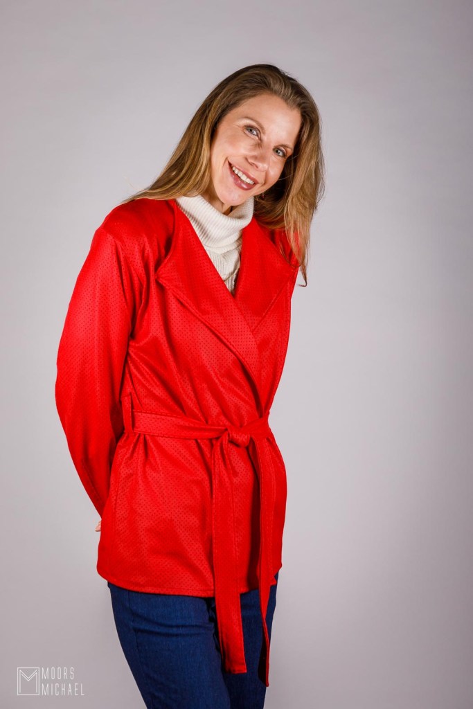 Toen naaivriendin Ilse me vroeg of ik interesse had in een grote lap felrood, soepel kunstleer met gaatjes, aarzelde ik geen seconde. Mijlenver uit mijn comfortzone, kon ik er toch niet aan weerstaan. Want rood, dat is stiekem een van mijn lievelingskleuren, al durf ik het niet vaak dragen.
