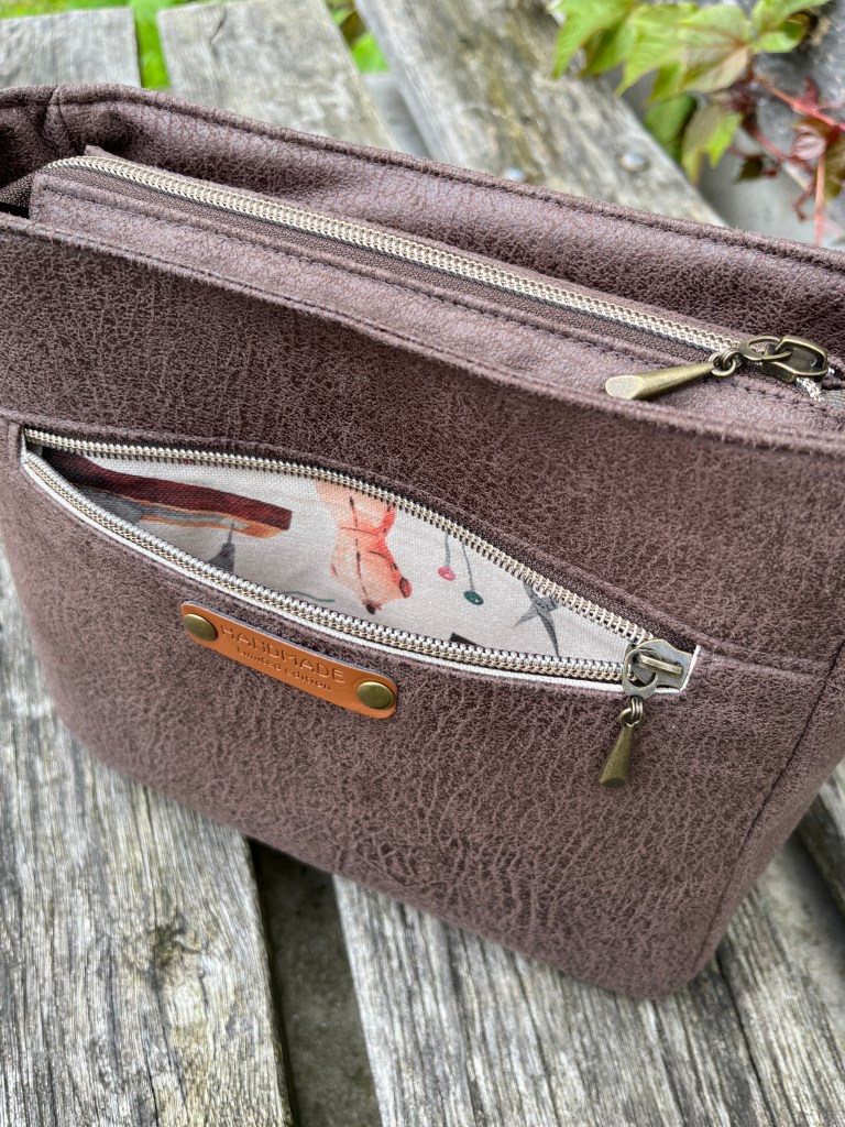 Net omdat ik soms alleen naar de plaatjes kijk, zette ik de voering van de buitenzak ondersteboven aan de rits. Ik merkte het pas toen de hele zak stevig in elkaar zat en had geen zin om alles weer open te maken, met het risico dat ik dingen kapot zou trekken. Maar ik zie het zo: je moet toch érgens aan zien dat het een hangemaakt stuk is, niet? LOL.