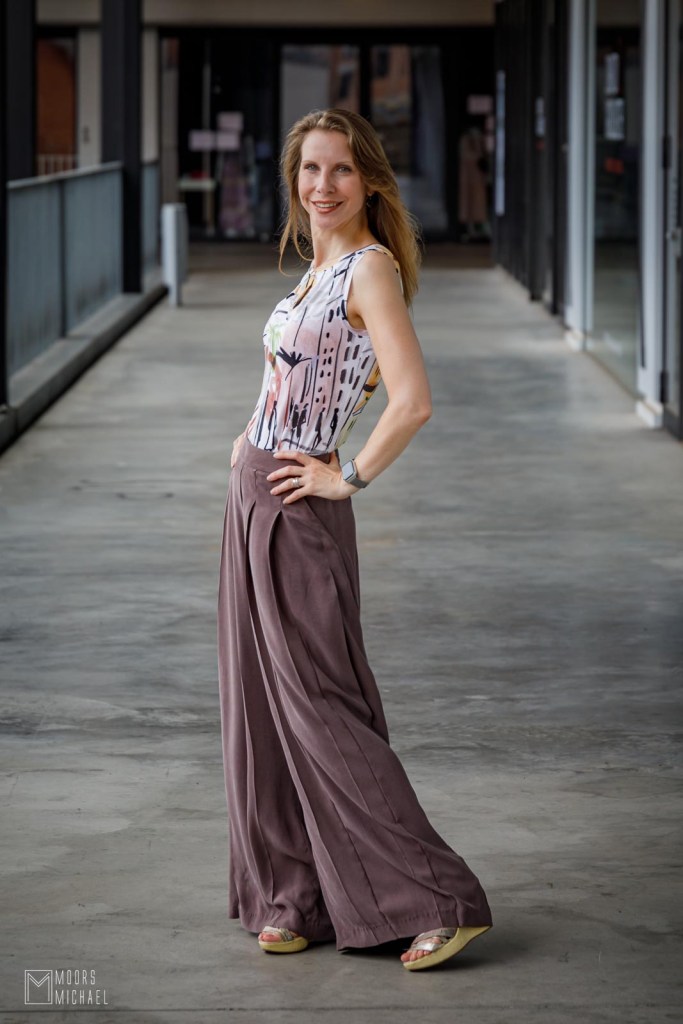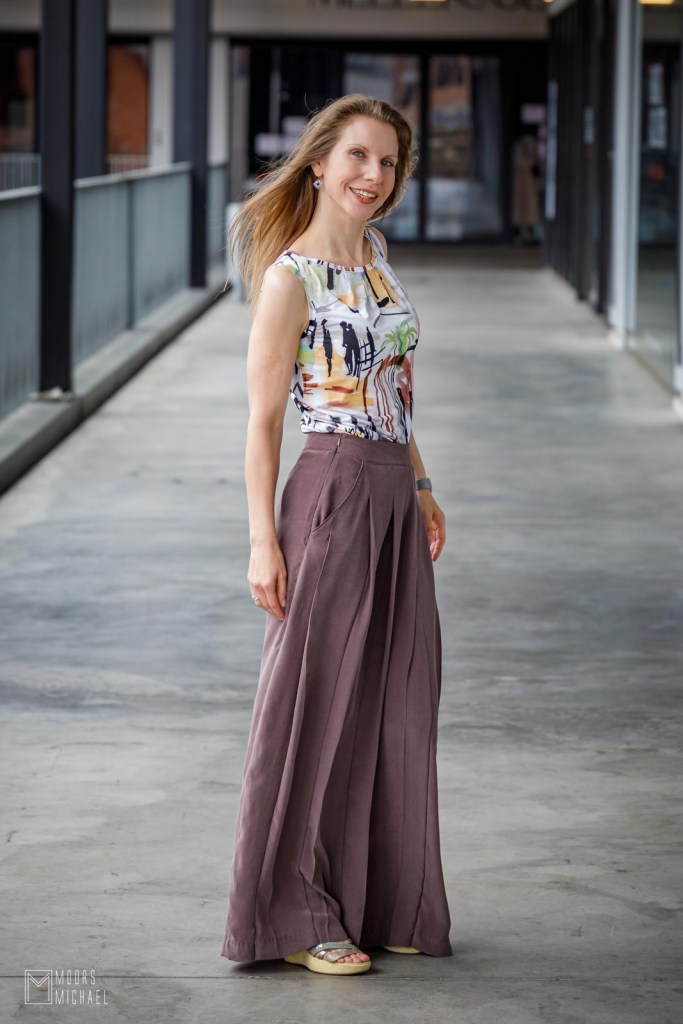 Bij de broek maakte ik een zomers topje in een superleuke, speelse, soepele viscosetricot van Editex. Ik ben zo’n wijde broeken niet gewend, dus koos ik voor een aansluitend model dat wat tegengewicht biedt aan de fladderende pijpen. Ik naaide de Camellia top van Sola Patterns, een leuke mouwloze top met plooitjes aan de hals. Pas toen ik mijn volledige outfit klaar had, besliste ik welke schoenen ik eronder wilde dragen. Ik maakte de broek zo lang mogelijk en draag er sandalen met plateauzolen onder. Dat verlengt mijn benen optisch, wat voor mijn lichaam met zo’n wijde broek onontbeerlijk is. Mijn lengte zit namelijk in mijn bovenlijf. Je zal mij dus heel vaak zien in broeken met een hoge taille die bijna over de grond slepen. Zo corrigeer ik mijn verhoudingen optisch en lijk ik langer dan ik ben.