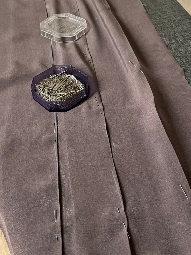 Van de plooien had ik wel een beetje schrik. Op papier was het mij niet meteen duidelijk hoe ik die moest leggen, dus plooide ik eerst mijn patroondeel. Plooien in papier is een stuk makkelijker dan in stof, valse plooien maken op dat moment niets uit en zo ben ik zeker dat ik het meteen juist doe op de stof. Het bleek eenvoudiger dan ik dacht. In de stof was het echter een heel ander verhaal. Bij Maaike las ik dat het vouwen makkelijk ging door de merkjes op elkaar te leggen, en dat de stof zichzelf in de plooi legde. Mijn prachtige, soepele, vloeiende cupro stof leefde echter een heel eigen leven. Na een paar vruchteloze pogingen besloot ik de vouwlijnen met rolkrijt op de stof te tekenen. Daarna plooide ik lijnen op de stof stukje voor stukje op elkaar en perste ze. Meteen daarna speldde ik de plooi over de volledige lengte vast om te voorkomen dat ze opnieuw opengingen terwijl ik de volgende plooi legde. Op die manier bracht ik alvast één broekdeel tot een goed einde. Moe van het geworstel met mijn plooien besloot ik eerst de achterpanden af te werken, en maakte ik een halve broek.