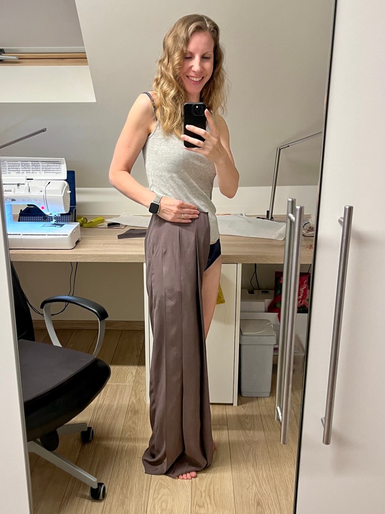 Het resultaat? Dat is nog beter geworden dan wat ik voor ogen had. Wil je een strak geplooide broek, dan kies je beter een iets zwaardere stof, maar voor een luchtige, fladderende, stoere statement-broek is cupro perfect. Of ik ze ooit nog ga strijken, daar ben ik niet zo zeker van. Ik ben benieuwd naar hoe ze eruitziet zonder de strak ingestreken plooien. In combinatie met mijn zomerse top kan het alvast niet misgaan!