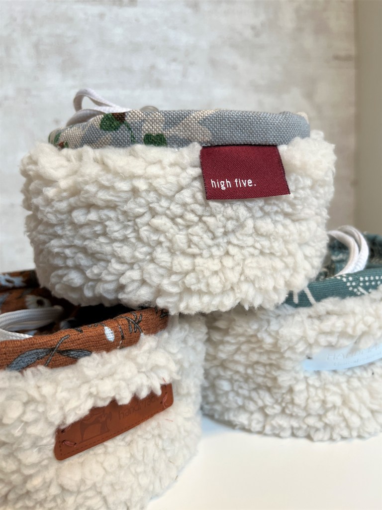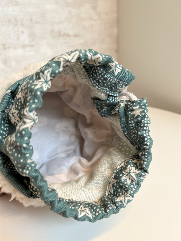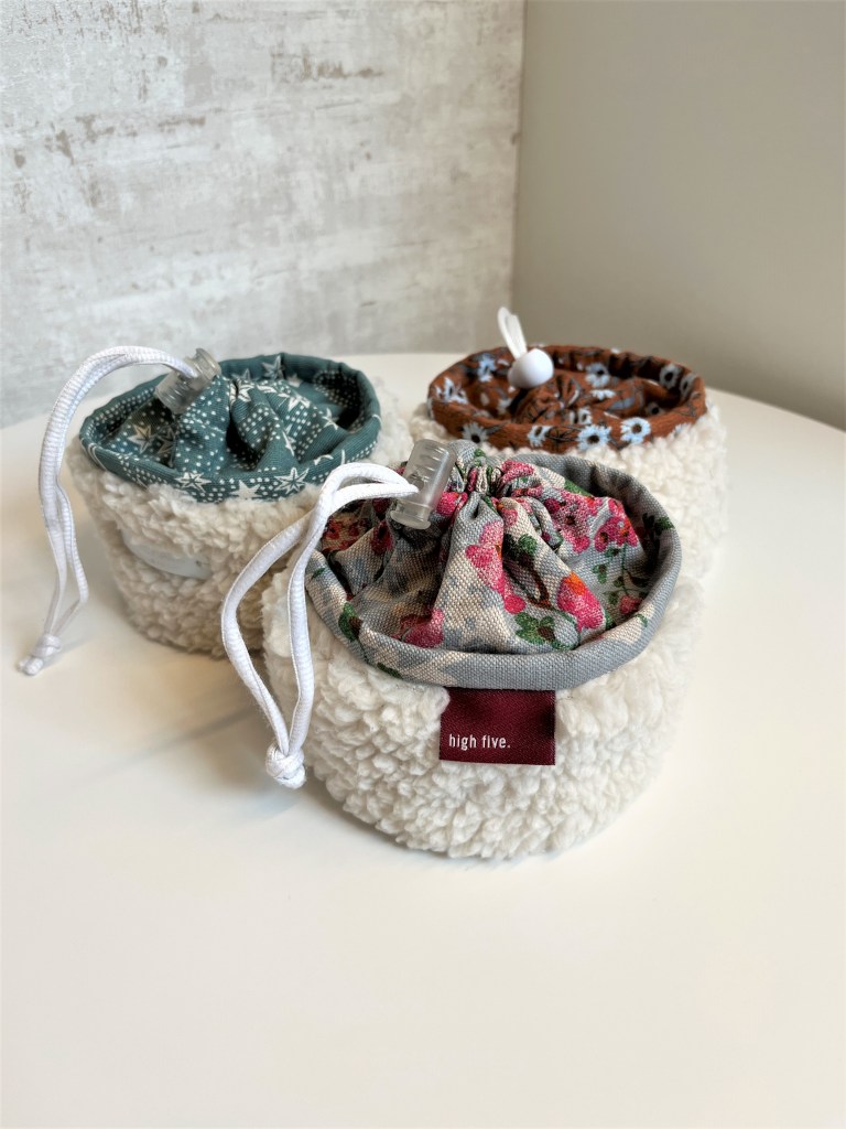 Daarna maakte ik een reeks cuties met een opstaande rand in teddy, een rest van een geboortecadeautje. De drie bijpassende stoffen selecteerde ik op maat van drie toffe madammen – een mama en twee dochters – die intussen hun cadeautjes al kregen. Het blauw gebloemde stofje is een canvas van De Stoffenknop, het groene is gordijnstof van Ikea en het roestkleurige is een rest van een rok in See You at Six stof. Ook hier kwamen de touwtjes en de koordstoppers uit mijn voorraad.