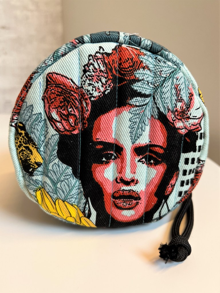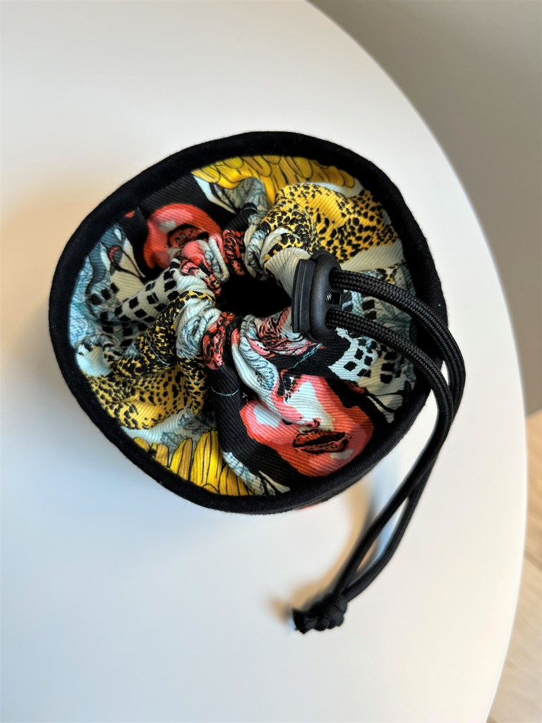 Omdat ik het hier vooral in gebruik zie voor kleine spulletjes zoals elastiekjes, haarspeldjes, juweeltjes… besloot ik te beginnen met een S. Daarvoor heb je echt niet veel stof nodig, dus knipte ik in een lang gekoesterde See You at Six canvas. Spannend altijd, want nu is de stof écht volledig op. Ik combineerde het stofje met een leuk soort kunstleer van Veritas, dat ik in de solden op de kop tikte. Ook de biais voor de bovenrand kocht ik bij Veritas, het touwtje en de koordstopper had ik in voorraad. Ik verzamel en hergebruik namelijk zoveel mogelijk ‘onderdelen’ van kledij en tassen die ik weggooi, maar die ik ooit wel eens zal kunnen gebruiken…