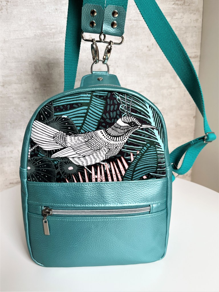 Yoshi is een compact rugzakje en je hebt eigenlijk niet zoveel stof nodig voor binnen-en buitentas. Ik dook dus in mijn voorraad en koos voor een zomerse-frisse combinatie. Het prachtige metallic green kunstleer, de tassenband en de rits-op-rol kocht ik een tijdje geleden bij ZipperZoo. Die passen wondermooi bij de tekening in groentinten van de See You at Six canvas waar ik bijna twee jaar geleden mee aan de slag mocht. De hardware en versteviging van de tas kocht ik zowel bij ZipperZoo als bij Serial Bagmakers.