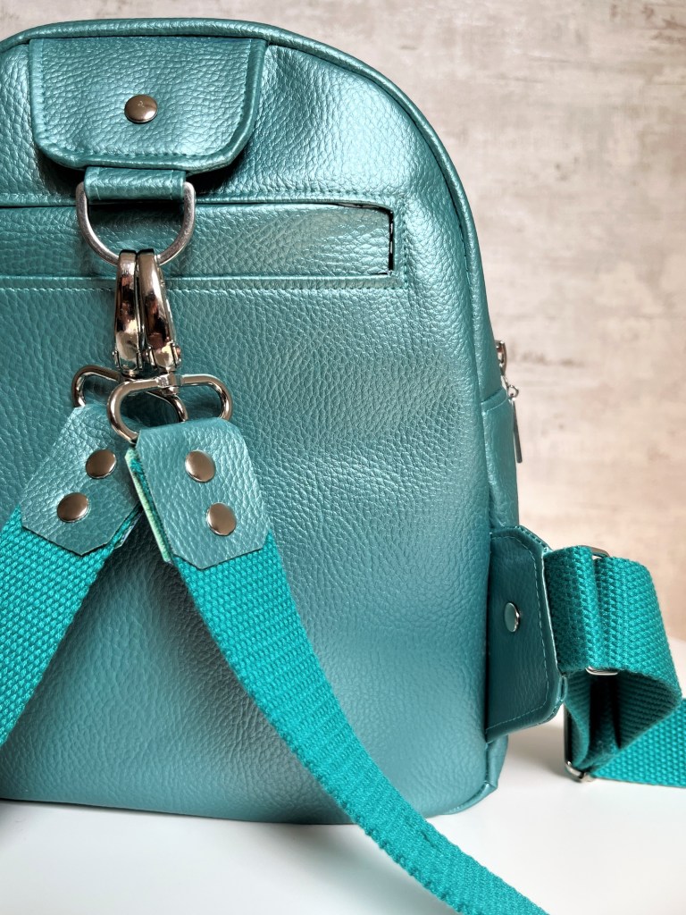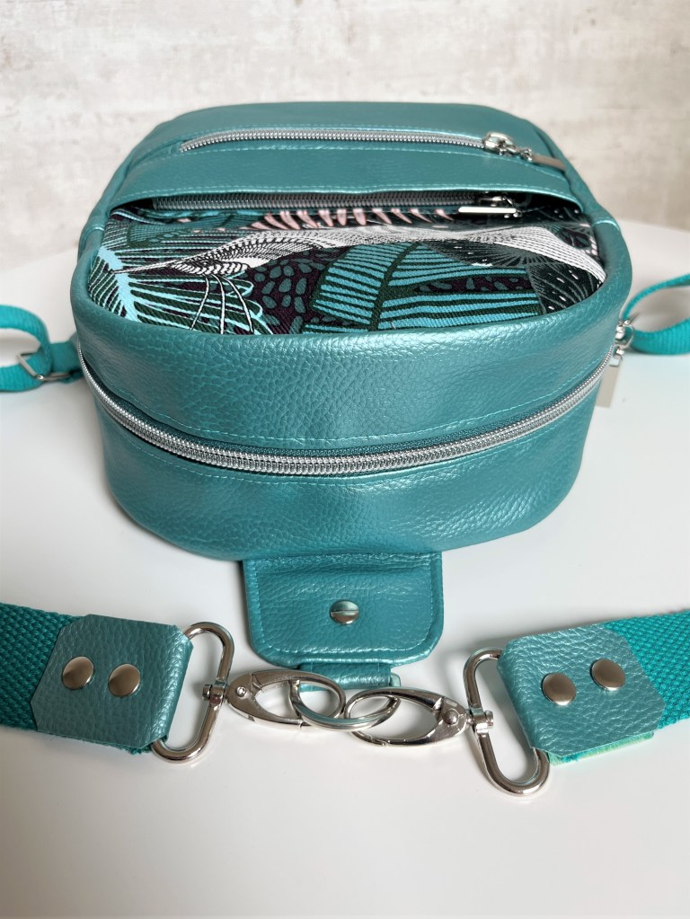 Omdat ik niet wilde wisselen tussen beide functies en dus al die musketonhaken eigenlijk niet nodig heb, besloot ik het patroon te hacken en de tassenband onderaan vast te maken aan twee rechthoekige passanten. Bovenaan behield ik de bevestiging met musketonhaken, zoals beschreven in de handleiding. De musketons hebben nu geen echte functie meer, maar ik vind het mooi zo. De tassenband werkte ik af met een stukje kunstleer en twee rivetten. Stevig, stijlvol en functioneel.