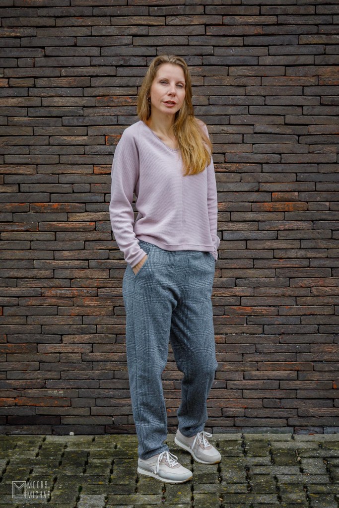 Het truitje maakte ik in een stofje van De Stoffenknop, maar vraag me niet wat voor iets het is… Het is een rekkende stof geschikt voor een truitje, maar niet heel dik. Ergens tussen tricot en French Terry in, met een ruw oppervlak. Misschien leest Chantal deze blog wel, en laat ze mij weten wat het precies was. Ik vond de lila kleur heel mooi, maar telkens als ik het uit de kast haalde, begon ik te twijfelen. Was dit wel een kleur die mij zou staan? Plus, is een volledig effen truitje niet een beetje saai?