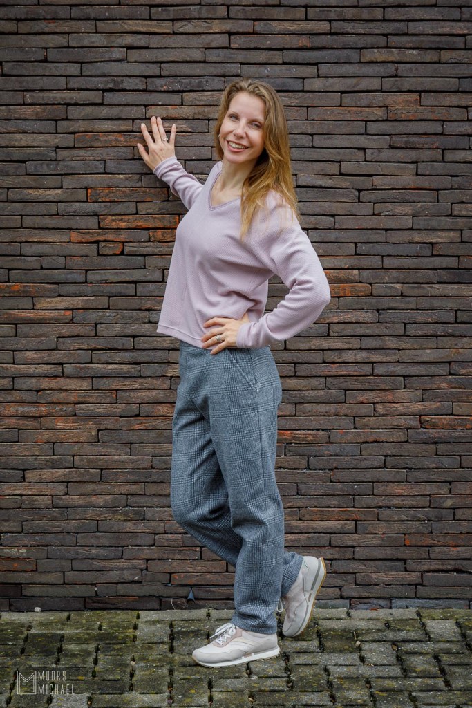Uiteindelijk besliste ik om een cardigan te maken. Ik tekende de Faye van La Maison Victor uit, en begon er met goede moed aan. Ik was echter vergeten dat ik meestal heel wat moest aanpassen aan de LMV patronen, en het truitje viel veel te groot uit. Door een stuk in het rugpand weg te nemen, en het voorpand dicht te stikken op een paar centimeter van middenvoor, werd het een draagbaar stuk, al is het nog veel ruimer dan ik in gedachten had. De combinatie broek-truitje is wel leuk, maar een stuk sportiever dan ik gewend ben te dragen. Zeker omdat ik het combineer met sneakers… dat zag je nog niet vaak, toch?