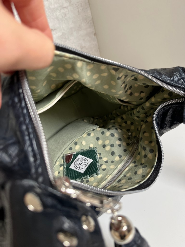 Ritsen, taspootjes, zeilringen en rivetten kocht ik bij ZipperZoo en Serial Bagmakers. De tassel recupereerde ik van een versleten gekocht tasje. Ik heb geen flauw idee waar ik de leuke voering gescoord heb, want ze bleek totaal anders te zijn dan ik dacht. Ik zag een stukje groen met witte bolletjes, en het bleek een soort paneel te zijn, met aan de zijkanten effen groen. Dat geeft de voering nog een tikkeltje extra.