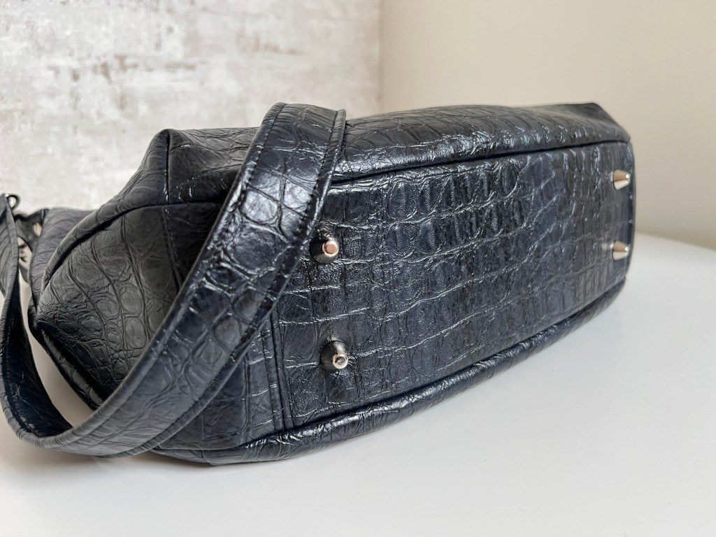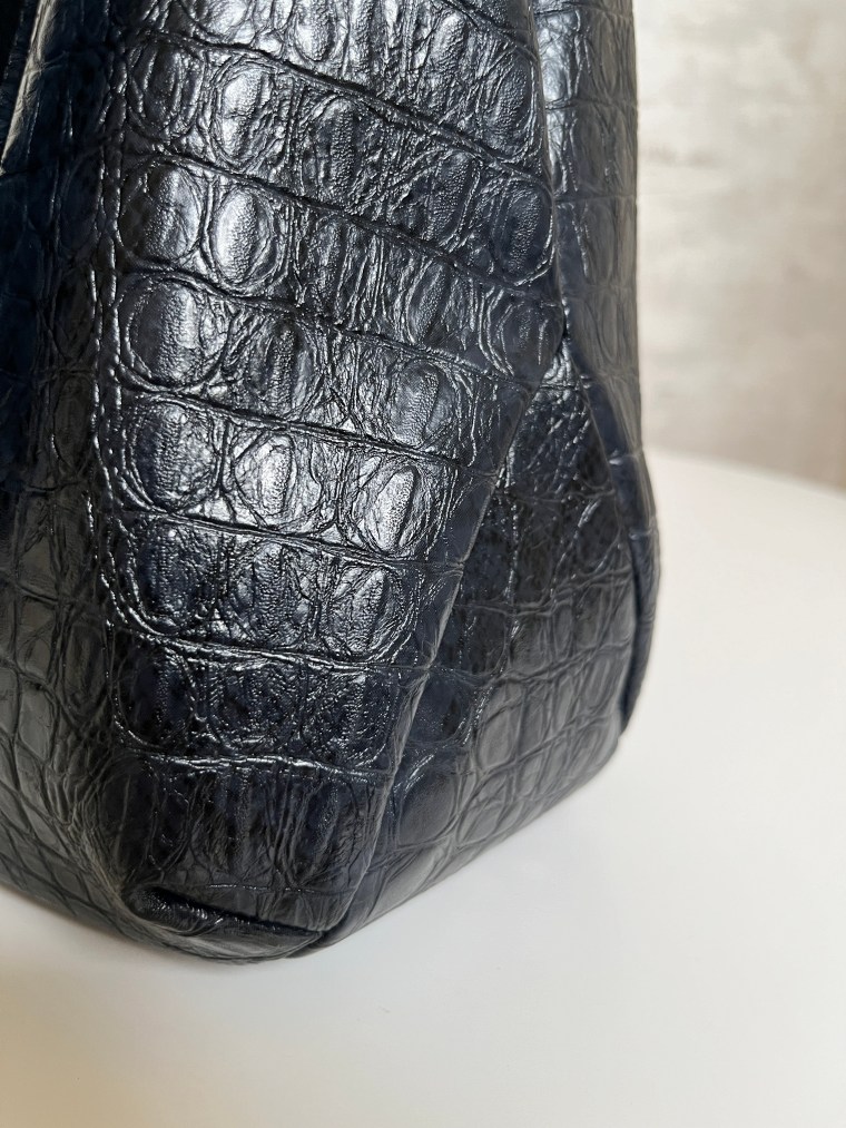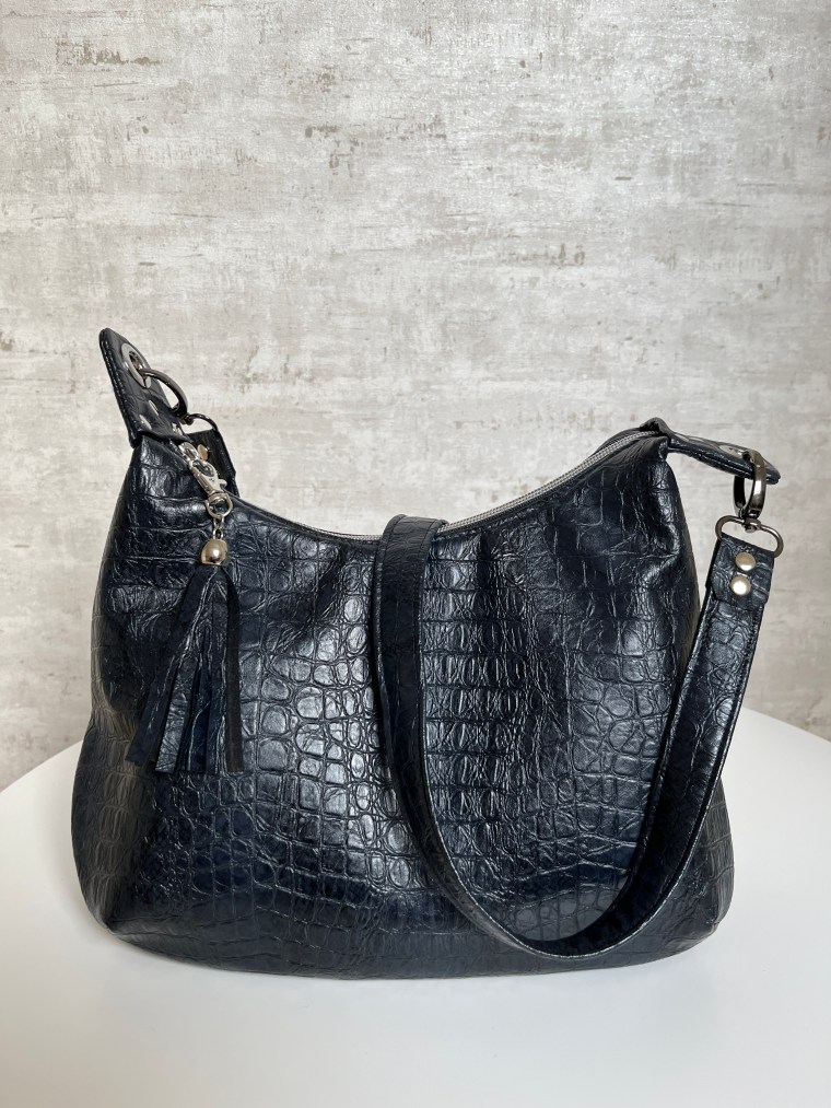 Soms moet je een stofje even koesteren voor je weet wat je ermee wil doen… Zo ook met dit prachtige croco kunstleer van Editex. Ik had een meter van deze blauw-zwarte beauty. Het kunstleer is licht rekbaar en heerlijk zacht aan de binnenkant, en in mijn hoofd ging de slinger constant heen en weer tussen een rok (zoals het prachtexemplaar van Miek), en een tas.