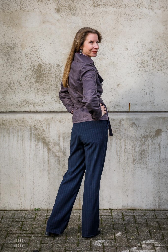Naast de vereenvoudiging door een gebrek aan stof, veranderde ik nog een aantal dingen aan het patroon. De zakken in het voorpand liet ik weg. In een lange trenchcoat vind ik die heel mooi, maar in de korte versie konden ze mij minder bekoren. Daarnaast had ik ook het klassieke holle-rug-probleem. Door mijn holle rug kan ik eigenlijk enkel fel getailleerde kledingstukken dragen zonder stofoverschot achteraan. Dit patroon is nogal recht en zelfs met een riem krijg ik dat probleem niet opgelost. Ik naaide dus twee figuurnaden ter hoogte van de holling, waardoor ik daar in totaal acht centimeter wegnam. Dat loste het probleem volledig op en nu past het vestje perfect!