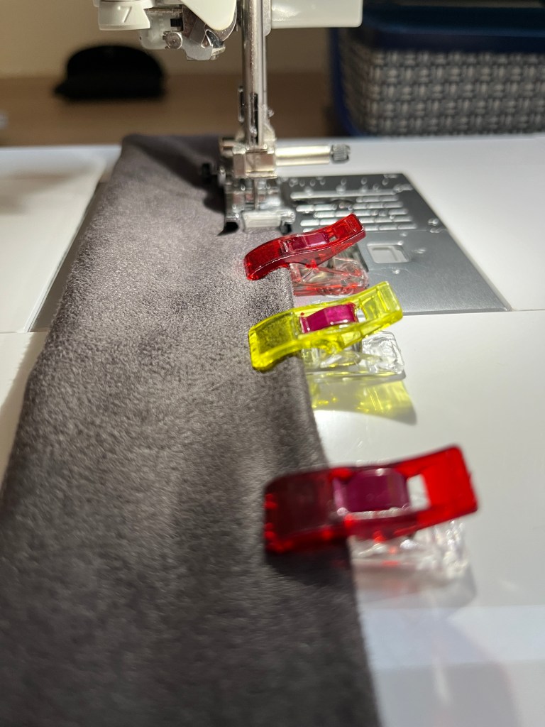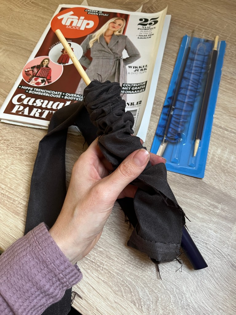 Werken met een waterbestendige stof is heel aangenaam, omdat dat soort stoffen meestal stevig zijn en dus geen eigen leven gaan leiden onder de schaar of tijdens het stikken. Het enige nadeel is dat je er ook beter geen spelden in steekt. Eens een gaatje, altijd een een gaatje… Ik werkte dus met wonderclips om de verschillende delen op elkaar vast te zetten. Werk je wel eens vaker met leer, kunstleer, suède? Dan is zo’n set clips zeker de investering waard. Een tweede tool die ik ontzettend handig vind tijdens het naaien is de draaiset van Prym. Vroeger haatte ik het om tunnels te moeten keren. Met het zware suède zou het deze keer extra pittig geweest zijn. Met die draaiset is de riem op 1-2-3 gekeerd, zonder een zuchtje moeite.