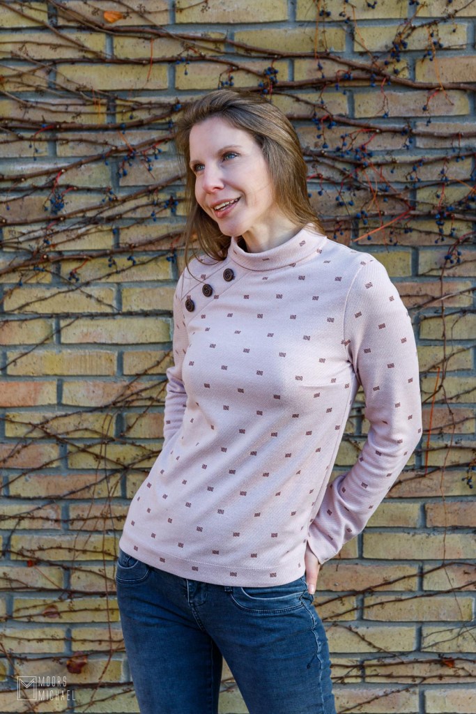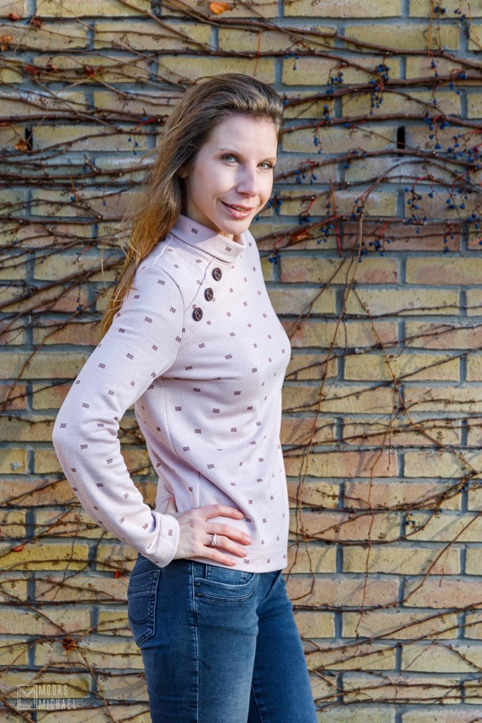 Zo gezegd, zo gedaan. Ondanks de twijfel of het wel zou uitdraaien zoals het in mijn hoofd zat, knipte ik in mijn gekoesterde stof. Omdat de stof een beetje rekbaar is, besloot ik een valse sluiting te maken, gecombineerd met een rolkraag. Voor een bloes heb je de extra opening wel nodig, maar bij een truitje krijg ik mijn hoofd er ook zo door.