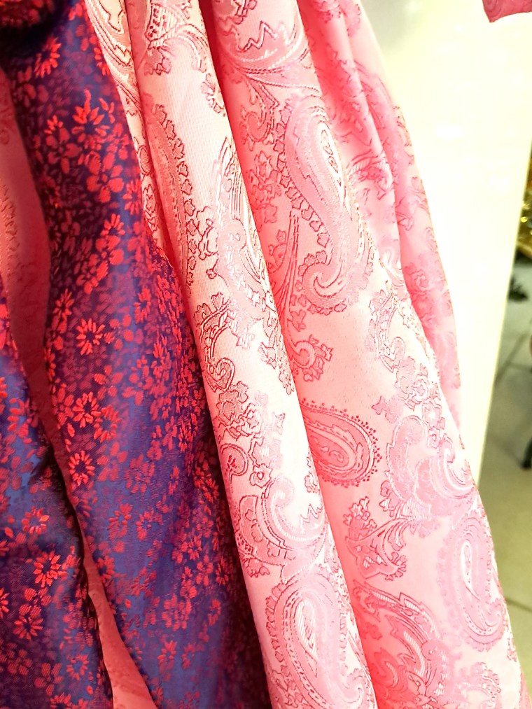 Ik heb geen glitterstofje gevonden maar Els had nog iets veel beters: voeringstof met een paisley motiefje… in het roze! Da’s al mooi. Nu nog iets om een accentje te leggen. Dat werd een donkerrood voeringsstofje. Tevreden over mijn buit keerde ik terug maar ik kon nog niet direct beginnen met naaien. Ik moet de chaos in mijn hoofd de baas blijven: daarom is het de regel dat ik een naaiproject afmaak voor ik aan een ander mag beginnen. Natuurlijk bleek mijn ander project iets langer te duren dan voorzien en ik had nog maar twee dagen voor het familiebezoek waar ik het moest afgeven. En ik had nog geen patroontje…